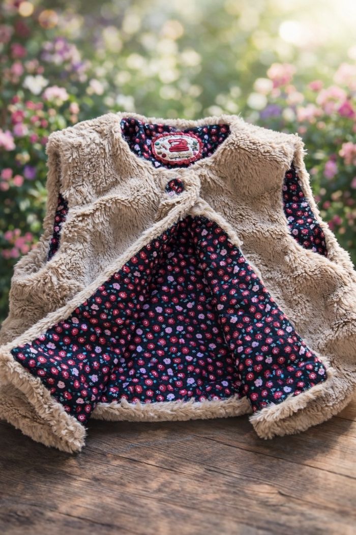 Gilet sans manches en fausse fourrure beige, intérieur fleuri. Très doux et chaud, fermeture bouton. En très bon état. Idéal mi-saison / hiver.