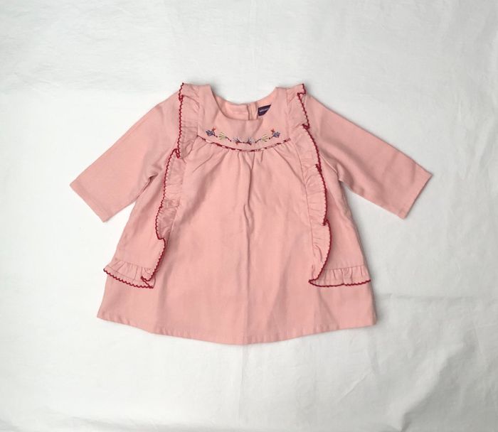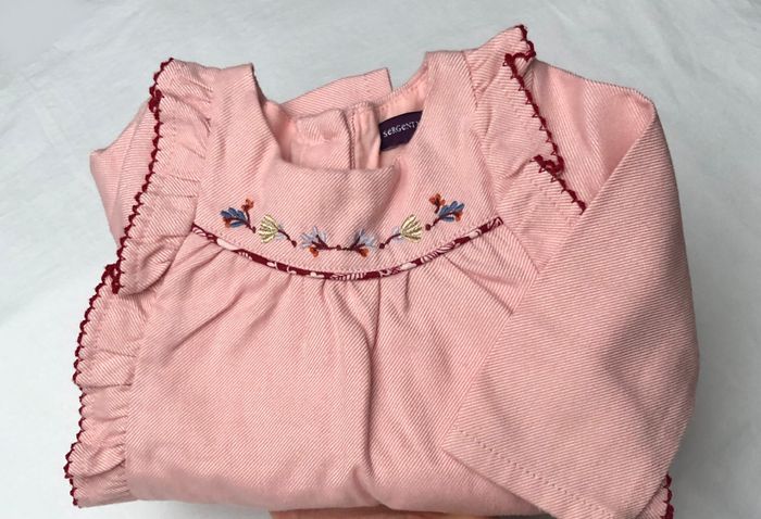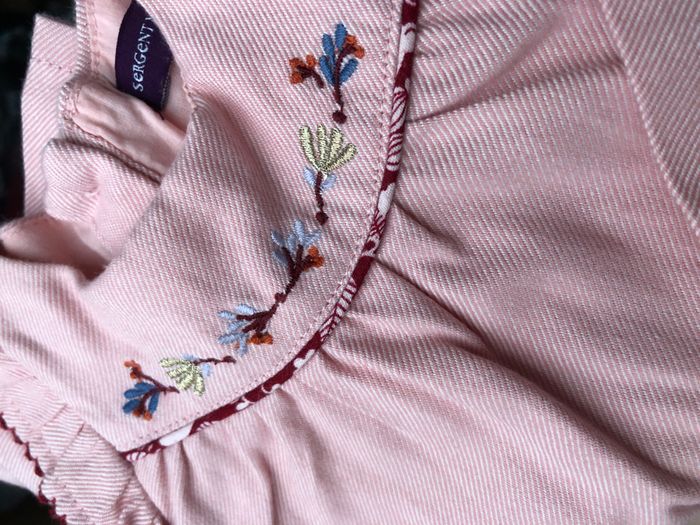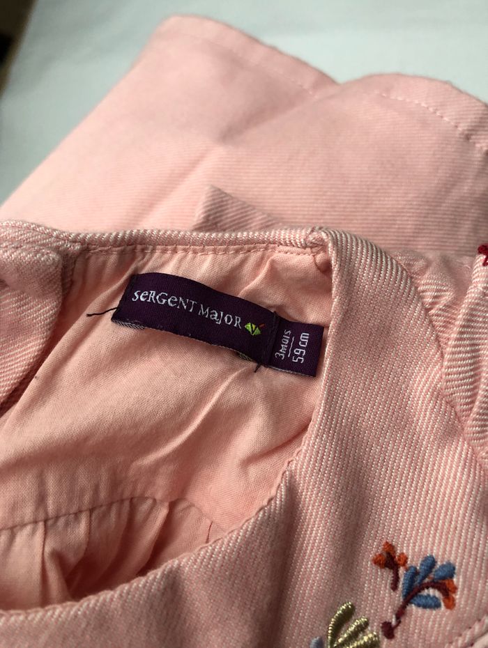 Très jolie robe Sergent Major, Taille 3 mois/ 59 cm, Hiver/ mi-saison, Doublée, Manches longues. De couleur rose clair, motifs fleurs bleues, dorées, bordeaux brodées, Deux grands volants sur l’avant. Ouverture intégrale avec des boutons tout le long du dos. En excellent état, pas de signe d’utilisation. 🌸 Vous aimez cet article ? N’oubliez pas de visiter le reste de mon dressing en filtrant les tailles.
