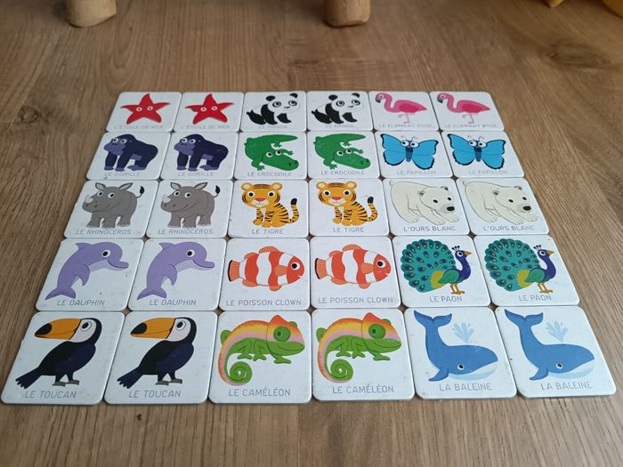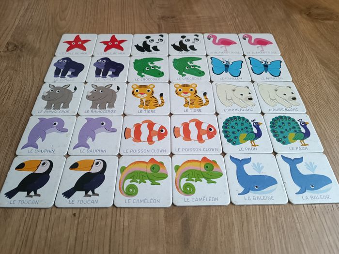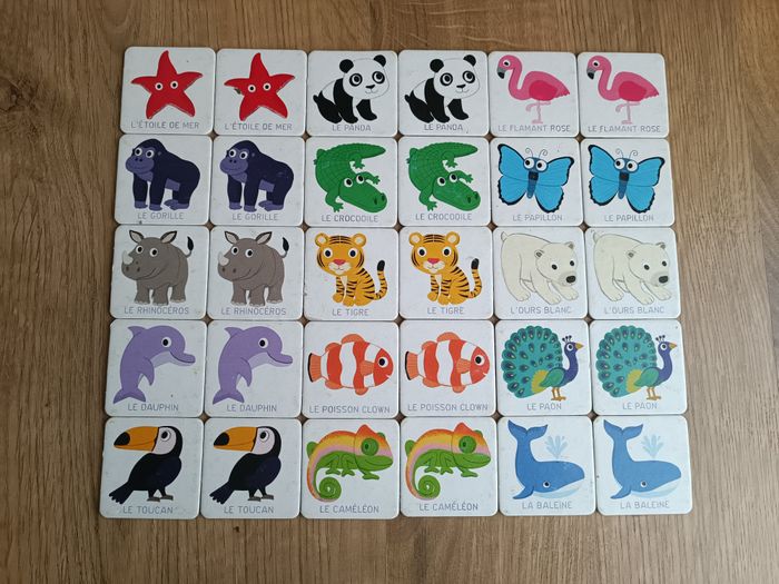 Mon premier mémo animaux. Du papillon au panda, un premier mémo pour découvrir et nommer les animaux du monde. Le but du jeu est de retrouver le plus d'animaux identiques. Un tout premier jeu d'observation de mémoire et de langage. Contenu : 30 cartes (4,5 x 4,5 cm)