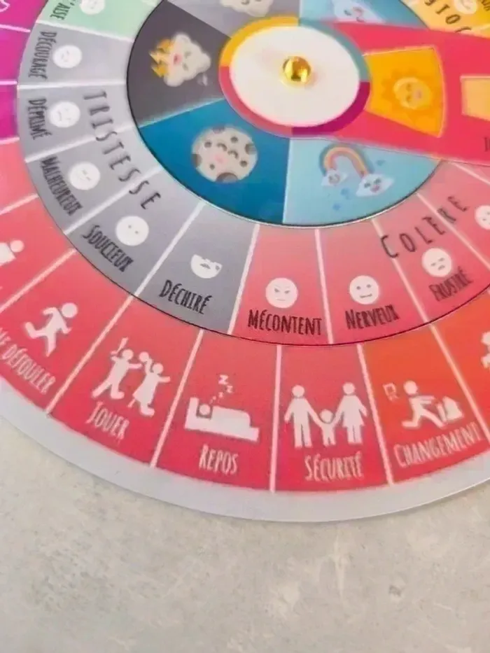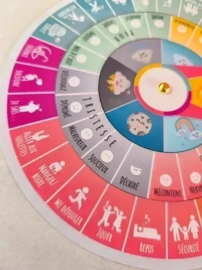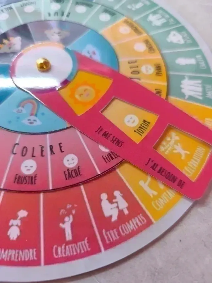 📍Roue des émotions, neuve. 📍20,5 cm de diamètre. 📍Papier 250G plastifié. Comment lire la roue des émotions ? 📍Avec la roue des émotions, les émotions centrales se trouvent au centre du cercle, ce qui est l'endroit le plus facile pour commencer. 📍Après avoir choisi l'émotion centrale la plus précise (joie, colère, peur, tristesse), l'enfant peut ensuite tourner la rondelle pour identifier les émotions plus spécifiques auxquelles il peut attribuer/relier un besoin sur les bords extérieurs du cercle. 📍Ainsi l'enfant a un outil incontournable pour améliorer son intelligence émotionnelle et un moyen efficace pour trouver des solutions à ses besoins. 📍Le but du la roue est de passer par 3 étapes : 📍Identifier comment on se sent 📍Associer ce ressenti à une émotion 📍Trouver ce dont on a besoin et associer ce besoin à cet émotion. 📫⏳ Envoi rapide et soigné le jour même de l'achat dans la mesure du possible!