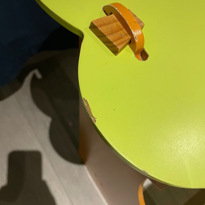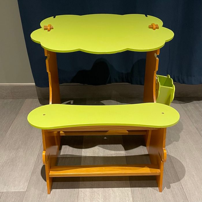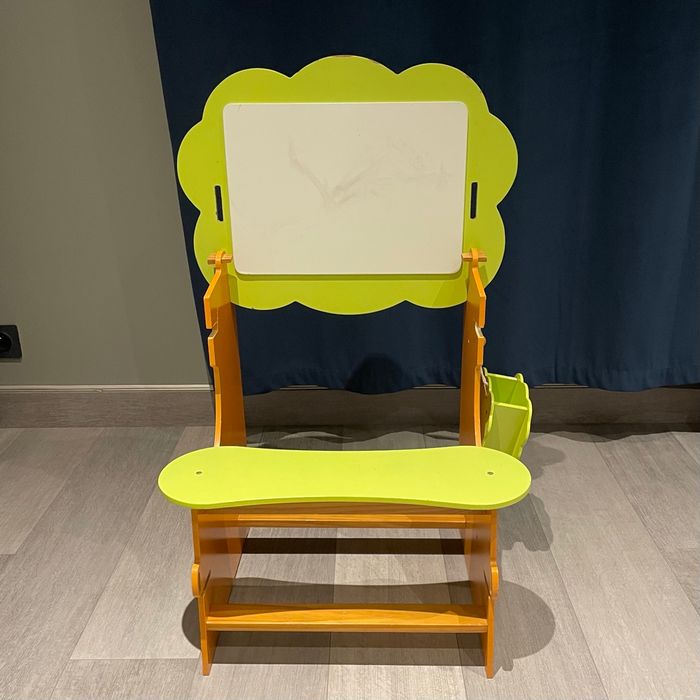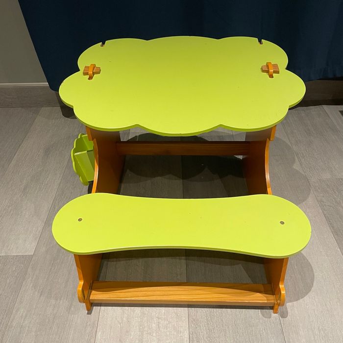 Petit bureau évolutif pour enfant en bois, avec 2 positions : • position à plat • position surélevée Le plateau est réversible : une face bureau classique et une face tableau blanc, idéal pour s’adapter à la taille et aux activités de l’enfant. Un petit panier en bois se fixe sur le côté pour ranger feutres et éponge. Solide et pratique Bon état général