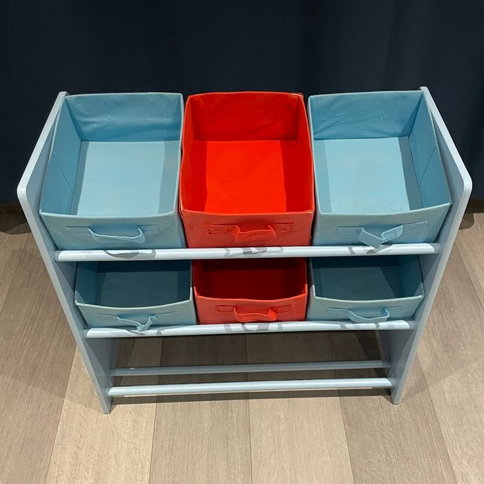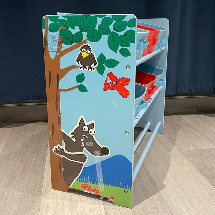 Meuble de rangement pour chambre d’enfant, marque Sauthon. Structure en bois peint bleu clair. Dimensions : L 65 cm x H 60 cm x P 30 cm Meuble avec pour 6 paniers en tissu amovibles (4 bleus, 2 rouges). Décors ludiques sur les côtés (loup, arbre, oiseau, avion). Stable, léger, facile à déplacer et à nettoyer. Convient dès le plus jeune âge. Bon état général.
