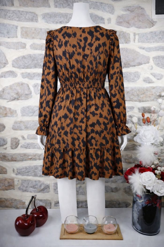 Robe échappée sauvage noire et caramel Femme taille 54 marque Boohoo ✴️ Col en V lavalière ✴️ Manches longues légèrement bouffantes ✴️ Taille élastiquée ✴️ Coupe fluide et évasée arborant un motif Iéopard audacieux noir sur un fond couleur carame ✴️ Composition => 95 % polyester 5 % elastanne ✴️Longueur => 101 centimètres ✴️ Mesure épaules à épaules => 48 centimètres ✴️ Tour de poitrine => 142 centimètres