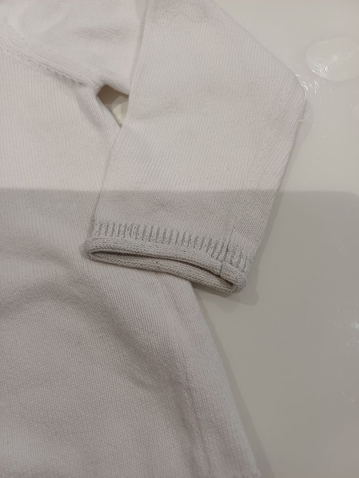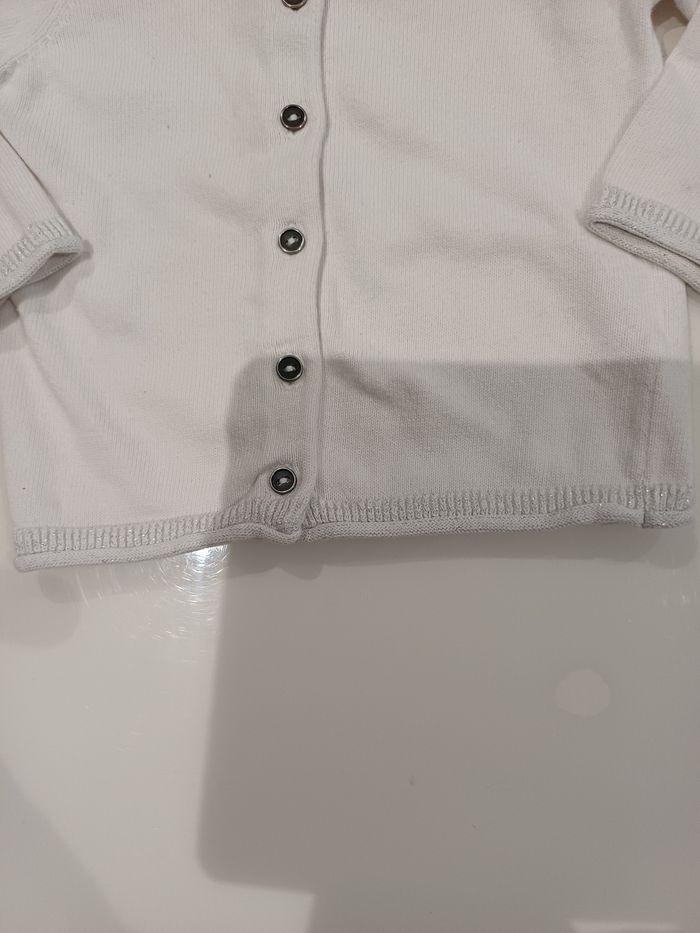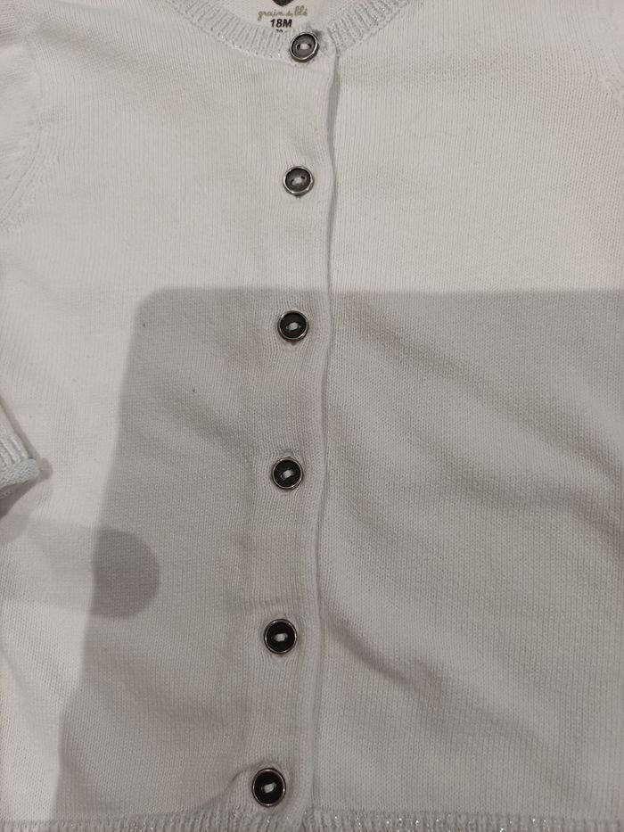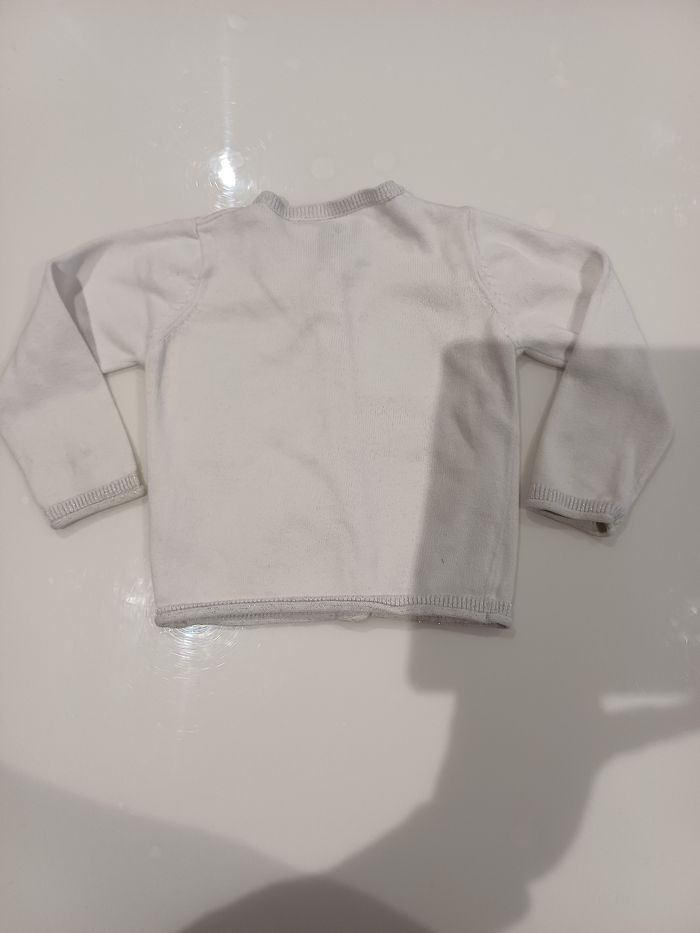 Très joli gilet blanc et gris pailleté en très bon état. La marque est GRAIN DE BLE et la taille 18 mois. Il s'attache avec 6 boutons voir la photo ci jointe.