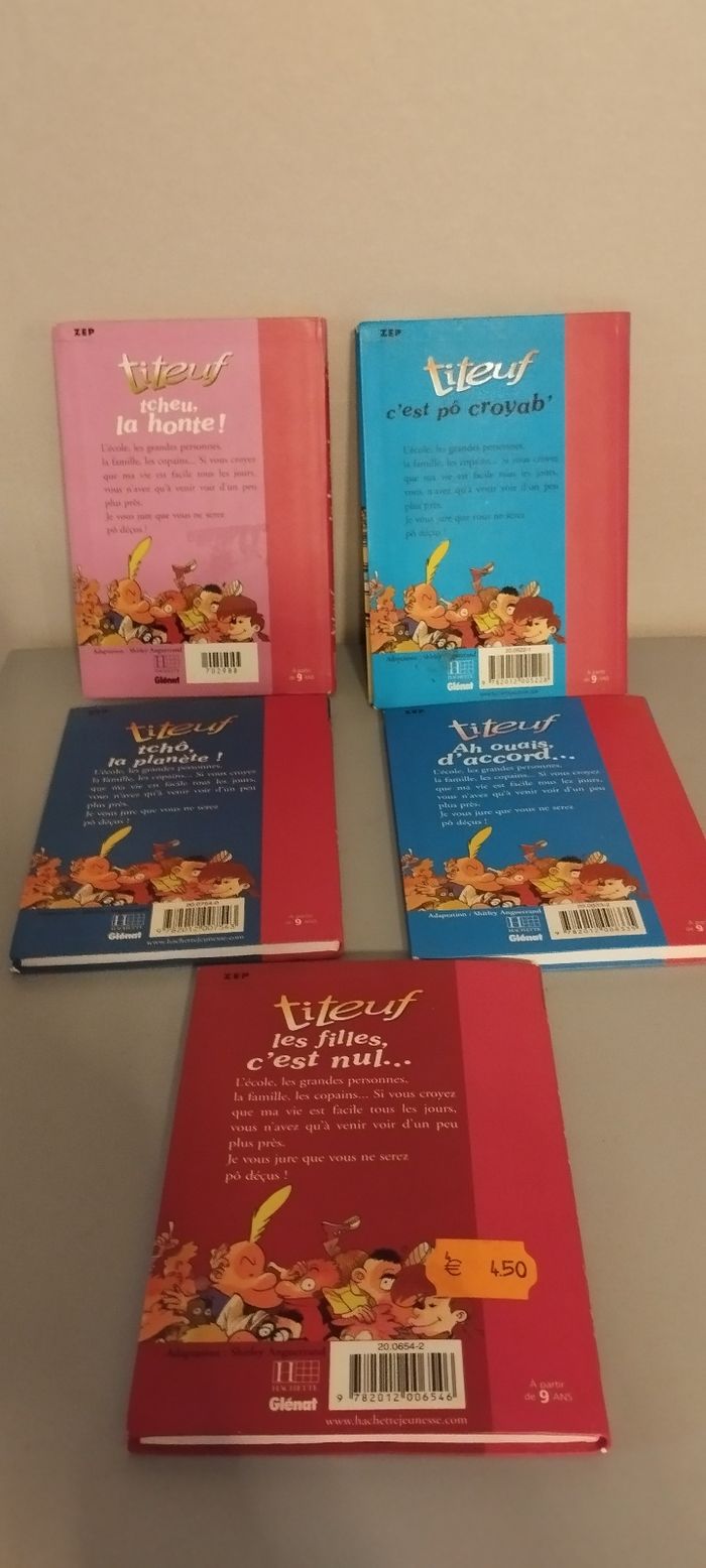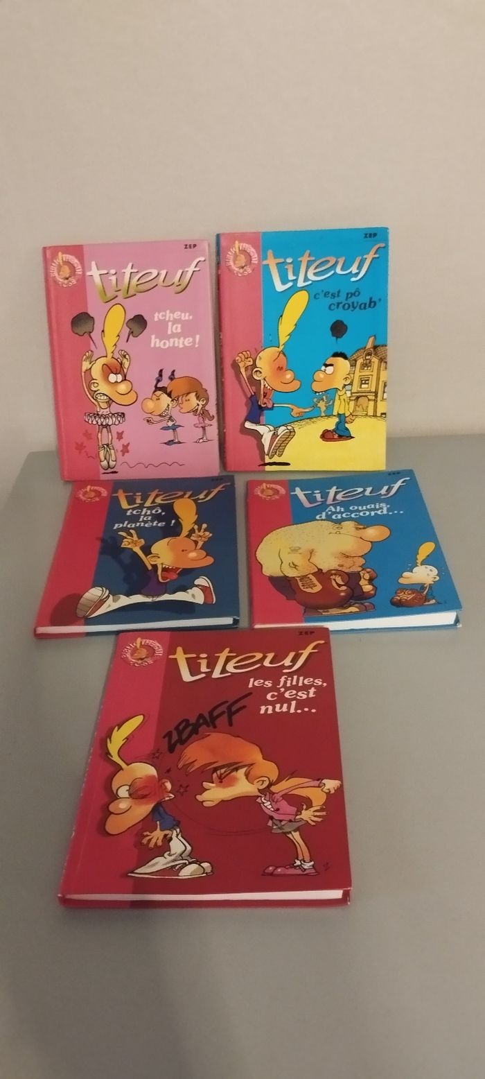 Lot de 5 Titeuf. Les filles, c'est nul... Ah ouais, d'accord... Tchô, la planète ! C'est pô croyab' Tcheu, la honte! Édition Hachette jeunesse. Bon état.