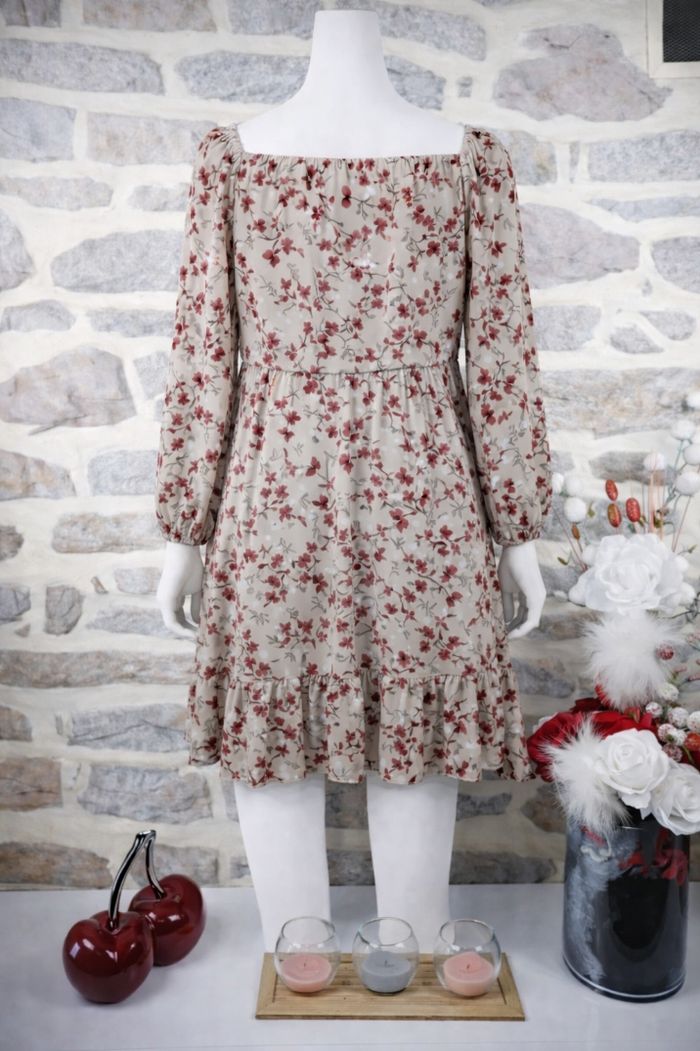 Robe romantique fleurie beige sable NEUF AVEC ÉTIQUETTE femme taille 3XL marque Ellen ✴️ Col carré légèrement bateau ✴️ Manches 3/4 bouffantes légèrement transparentes ✴️ Poignets élastiqués ✴️ Effet froissé drapé au niveau du buste ✴️ Taille élastiquée ✴️ Coupe fluide et aérienne arborant ne teinte de fond beige clair/sable élégante, parsemée de délicates fleurs rouge bordeaux et de petites touches blanches, créant un motif floral discret et romantique. ✴️ Composition => 100 % polyester ✴️ Lonqueur => 97 centimètres ✴️ Tour de taille => 114 centimètres ✴️ Tour de poitrine => 130 centimètres