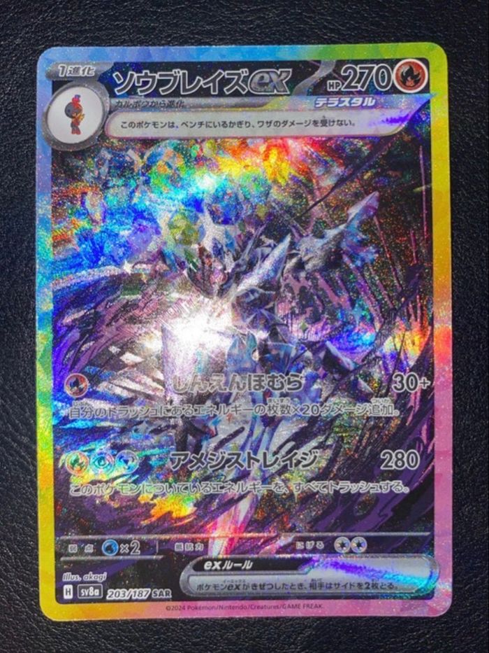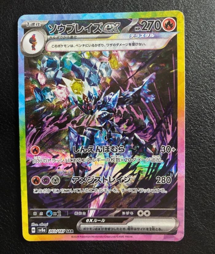carte Malvalame ex (Ceruledge ex) SAR 203/187 du set japonais SV8a – Terastal Festival est une carte Rare Illustration Spéciale (Special Art Rare) très recherchée, mettant en scène Ceruledge dans un style artistique vibrant et dynamique.