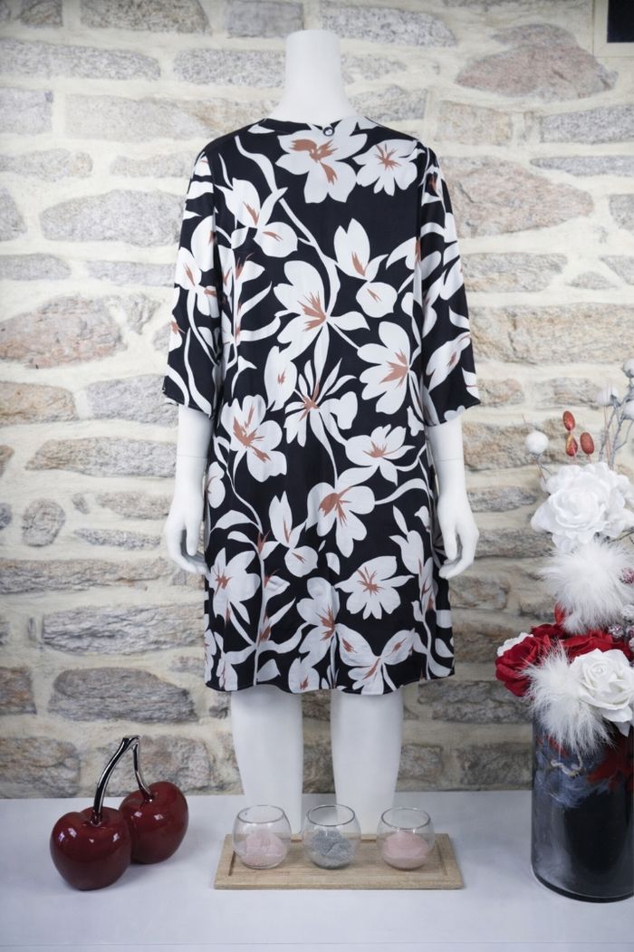 Robe florale noire , blanche et camel Femme taille 54 marque Asos ✴️ Col en V ✴️ Manches trois quarts fluide ✴️ Coupe ample et évasée arborant un motif floral généreux en noir profond, blanc pur et camel délicat ✴️ Composition => 100 % polyester ✴️ Longueur => 101,5 centimètres ✴️ Mesure épaules à épaules => 47 centimètres ✴️ Tour de poitrine => 140 centimètres