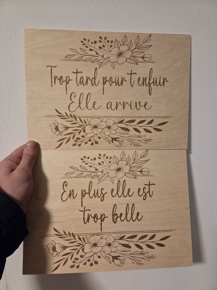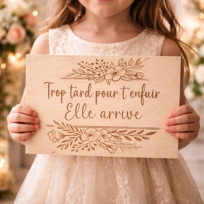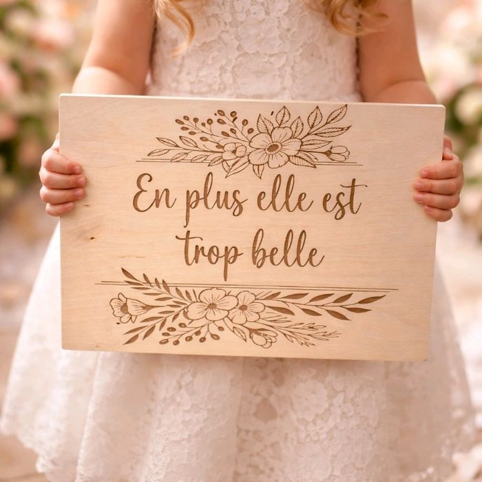 Affiches en bois au format A4, soigneusement gravée au laser pour un rendu élégant et raffiné. Le bois, avec son grain naturel, donne du caractère à l’affiche, offrant une texture chaleureuse qui contraste joliment avec la gravure nette et précise. Les affiches sont conçues pour être interactive, permettant aux enfants de participer à l’événement. Placée à l’entrée du lieu de cérémonie ou portée comme un élément ludique par des enfants dans le cortège, elles apportent une touche de complicité et d’humour à l’entrée de la mariée. Une idée originale qui mêle tradition et amusement pour rendre l’instant encore plus mémorable. Chaque affiche est unique et fabriquée avec un matériau naturel. L’article peux présenter des défauts visuel comme des rainures ou des noeuds.