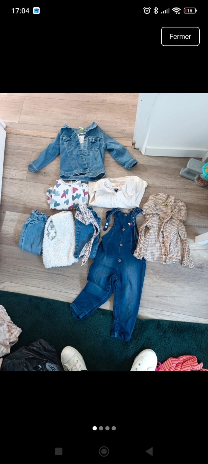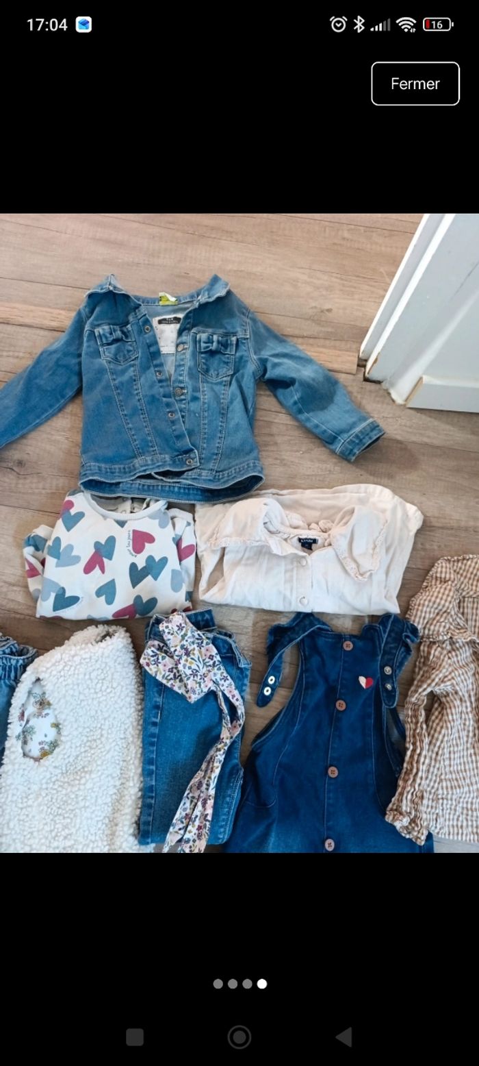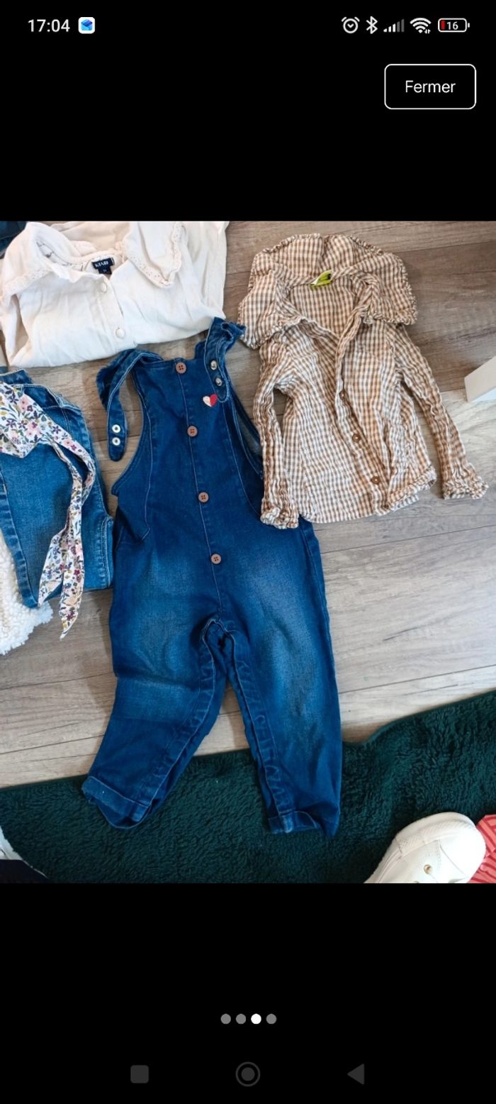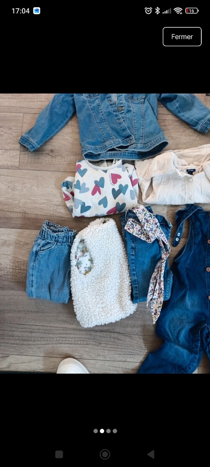 Vends une veste en jean tape à l'oeil 24 mois Un chemisier beige Kiabi Un chemisier marron tape a l'oeil Un pull tape a l'oeil 2 jeans Une salopette obaibi Un petit gilet sans manche 18 mois taille grand .