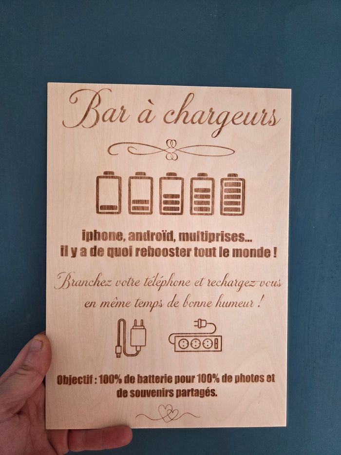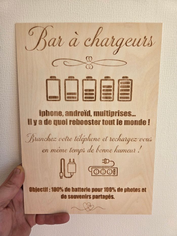 Améliorez l’expérience de vos clients ou invités avec cette pancarte Bar à Chargeurs en bois format A4, idéale pour signaler clairement un espace de recharge pour téléphones et appareils électroniques. À la fois fonctionnelle et décorative, cette pancarte en bois apporte une touche chaleureuse et naturelle à votre mariage. Elle s’intègre parfaitement dans une boutique, un café, un restaurant, un salon, un bureau ou un espace d’accueil. Son format A4 offre une excellente visibilité sans encombrer, que ce soit sur un comptoir, une table ou à proximité d’une prise électrique. Une solution simple et élégante pour informer vos clients qu’un bar à chargeurs est à leur disposition. Chevalet en suppléant pour 2e