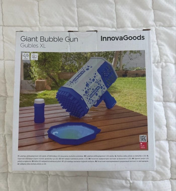Giant Bubble Gun – Gubbles XL Marque : InnovaGoods Super pistolet à bulles géant avec effet lumineux LED ✨ Parfait pour le jardin, anniversaires, fêtes ou vacances. 🔹 Modèle XL 🔹 Effet bulles multiples 🔹 Avec LED 🔹 Facile à utiliser 🔹 Idéal en extérieur 📦 État : Neuf