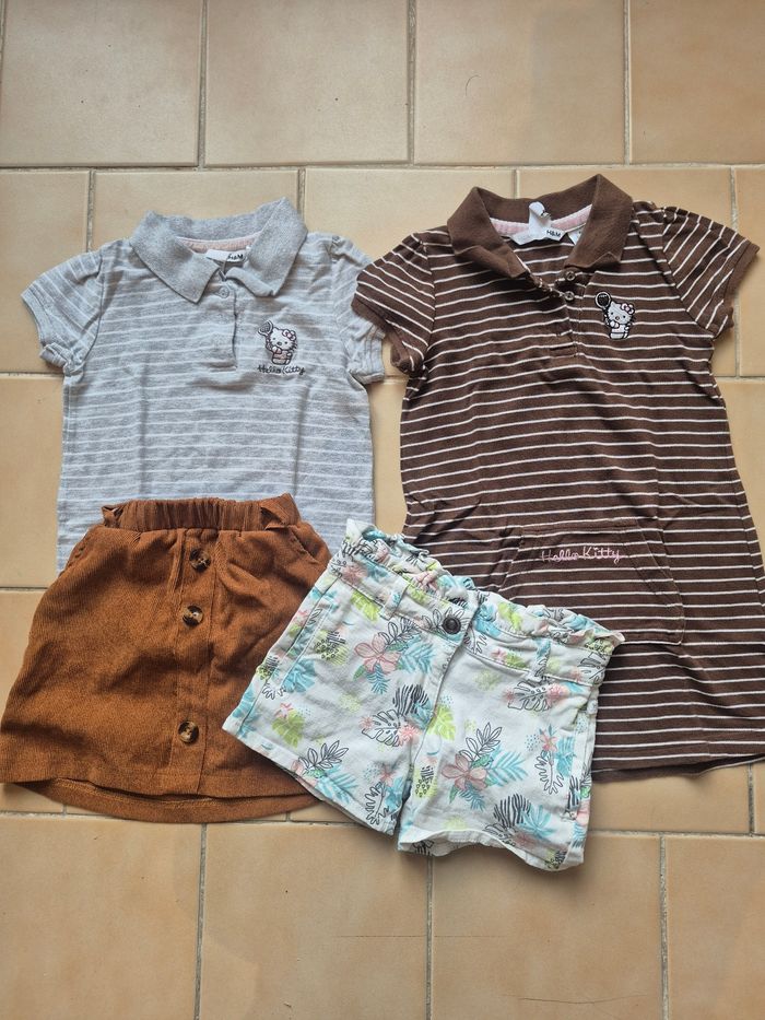 Lot de 14 vêtements été fille 5 ans en très bon état, principalement orchestra et kiabi, le lot est composé de : 5 t-shirts manches courtes 1 débardeur 3 t-shirts manches longues 1 chemisier 1 polo hello kitty 1 robe hello kitty 1 short 1 jupe (il manque un bouton, voir photo 3)