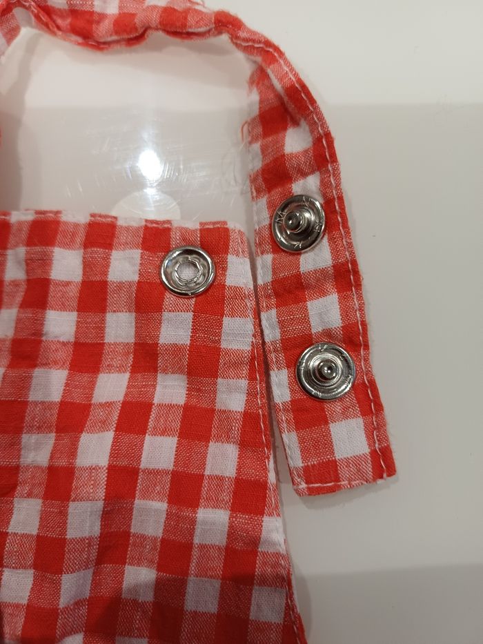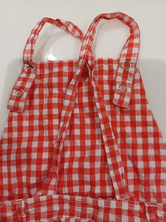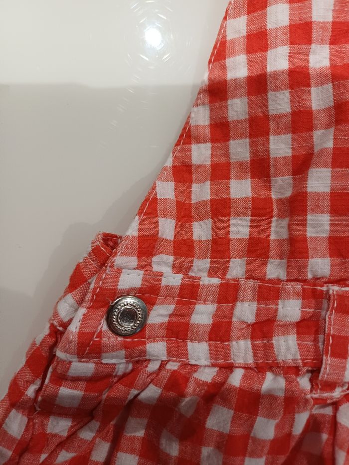 Très jolie robe à bretelles rouge et blanche en très bon état. La marque est GEMO et la taille 12 mois. Les bretelles sont réglables voir la photo ci jointe et s'attache avec des pressions voir les photos ci jointe. Le bas de la robe à une doublure.