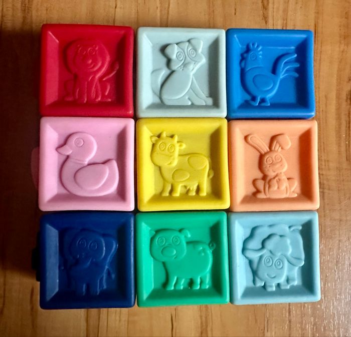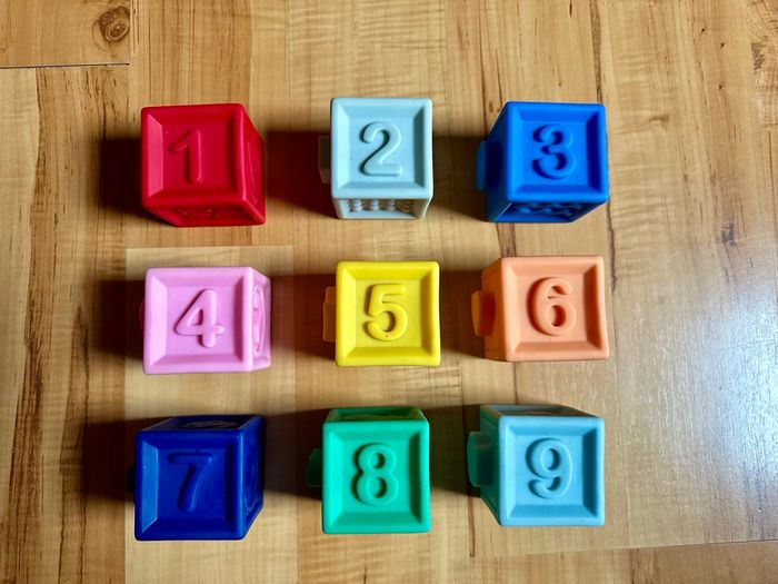 Cubes en plastiques numérotés de 1 à 9 Parfait dès bébé et évolutif. Possibilité de faire une tour avec et de les emboîter. Très bon état.