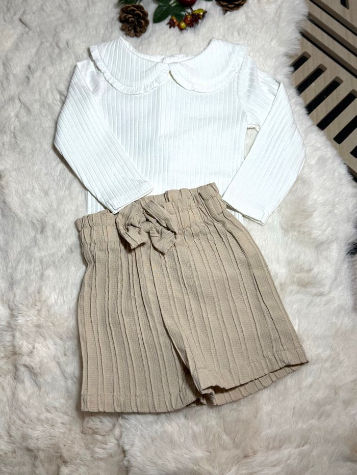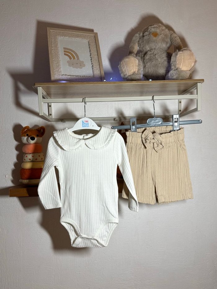 Magnifique ensemble bébé 9 mois, tout en douceur et élégance 🤍 ✨ Body blanc manches longues en maille côtelée ✨ Adorable col Claudine pour un effet chic ✨ Short beige fluide taille élastique ✨ Coupe confortable et facile à enfiler Tenue parfaite pour une cérémonie, un anniversaire, une séance photo ou simplement un look trop mignon au quotidien 🥰 Style bohème / intemporel qui fait toujours son petit effet 🤍 Taille 9 mois - 74cm État neuf , jamais porté