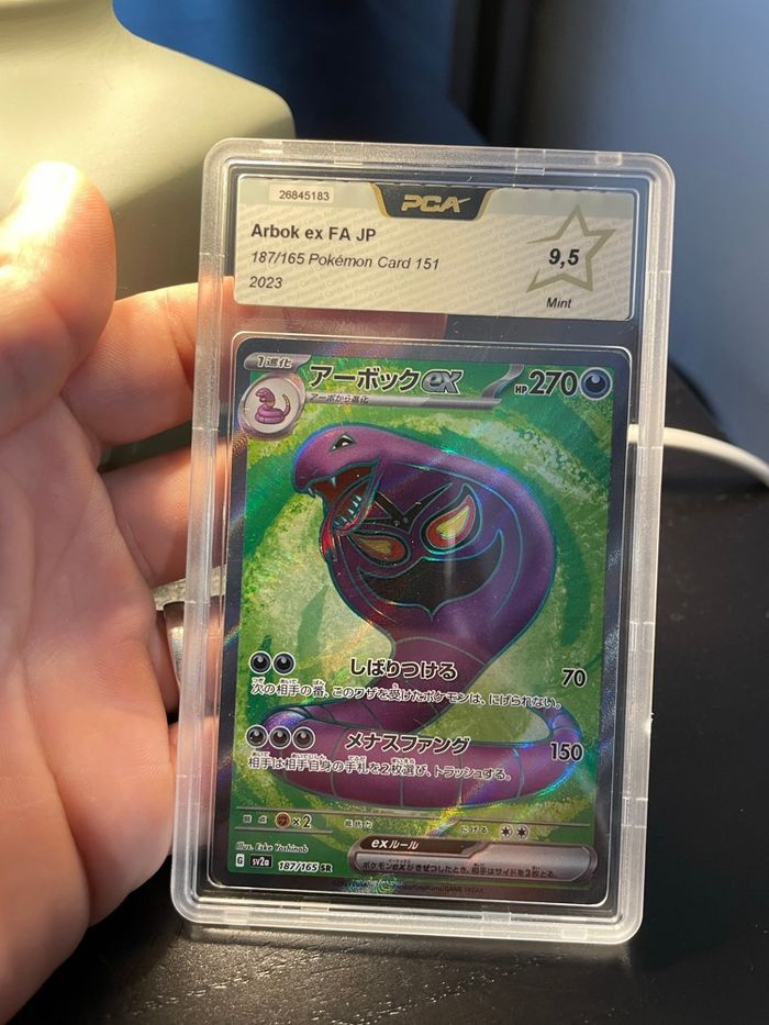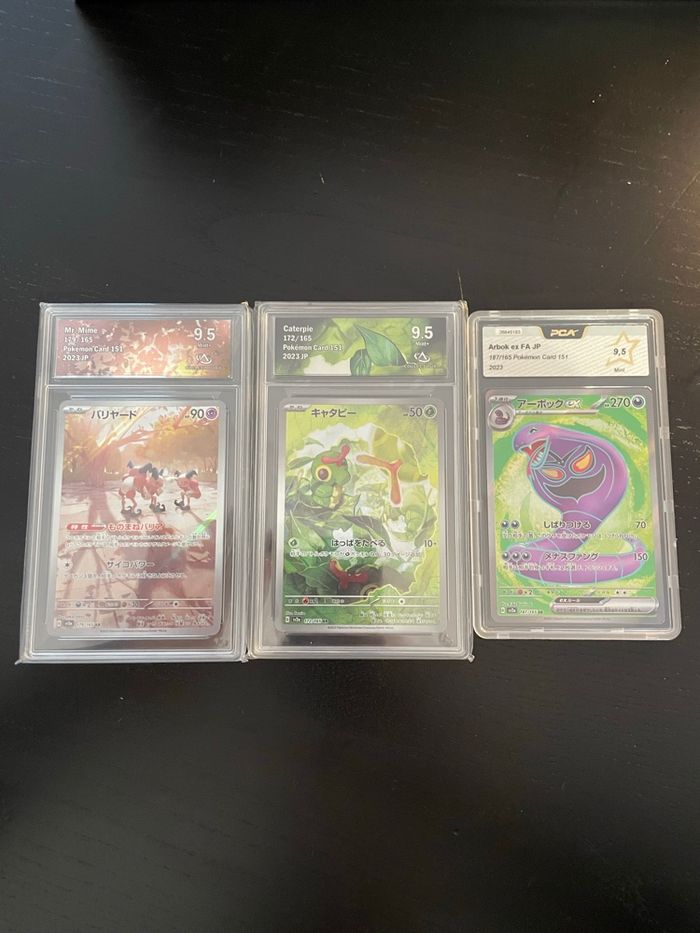 Pokemon lot 3 carte gradé de la serie 151 sv2a japonaise - Mr mime AR 179/165 collect aura 9.5 - Chenipan AR 172/165 collect aura 9.5 - Arbok FA SR 187/165 PCA 9.5 Équivalent ссс / psa / sfg / beckett Échange possible contre evolution prismatique 8.5 Ev9 aventure ensemble Ev10 team rocket Mega evolution ME01 Me02 Me2.5
