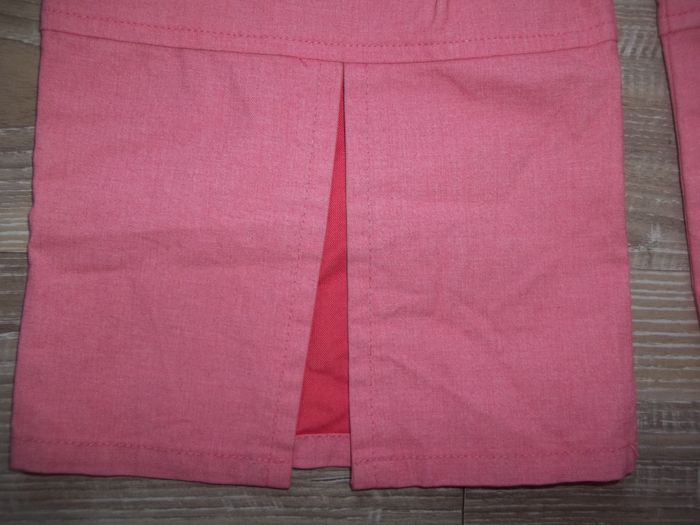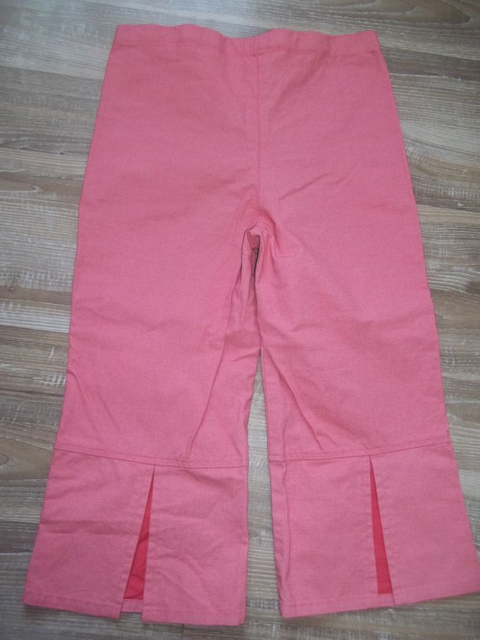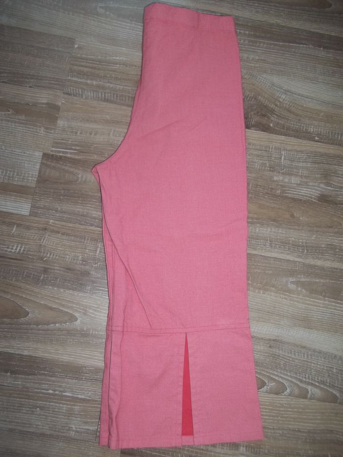 Pantalon en 100 % coton rose un peu orangé, jambes plutôt larges s'arrêtant sous genou avec fente sur mollet, patchwork "4" bas jambe gauche. Fermé par zip et bouton. 2 poches devant. Quasiment neuf. Entrejambe 39 cm, hauteur totale sur côté 62 cm, largeur taille 28 cm (légèrement élastiquée dos), bas jambes env 21 cm