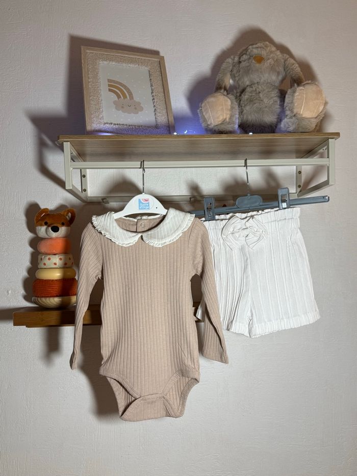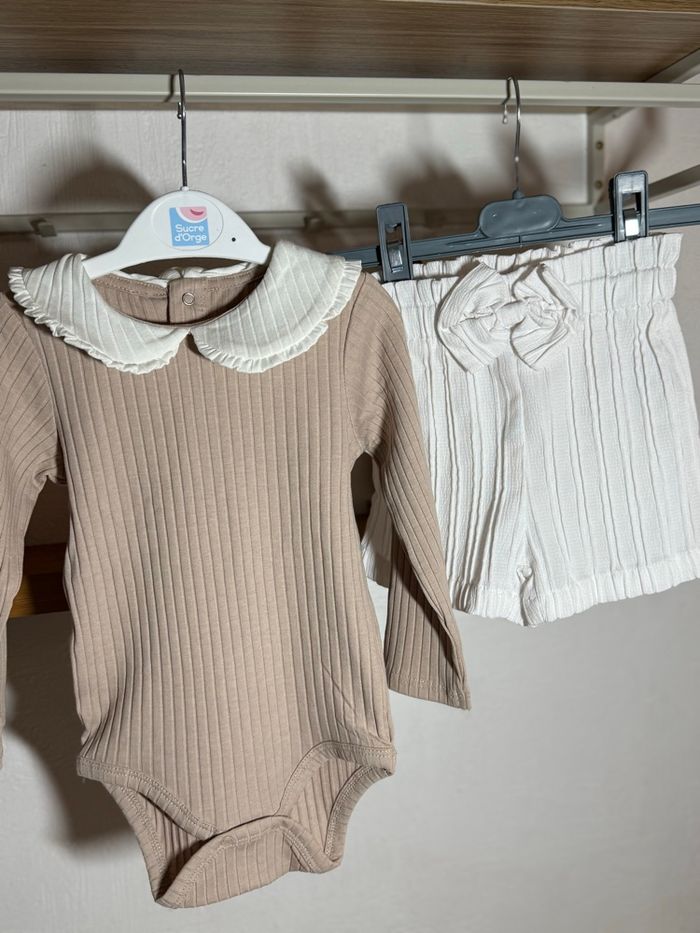Magnifique ensemble bébé 12 mois, tout en douceur et élégance 🤍 ✨ Body beige manches longues en maille côtelée ✨ Adorable col Claudine pour un effet chic ✨ Short blanc fluide taille élastique ✨ Coupe confortable et facile à enfiler Tenue parfaite pour une cérémonie, un anniversaire, une séance photo ou simplement un look trop mignon au quotidien 🥰 Style bohème / intemporel qui fait toujours son petit effet 🤍 Taille 12 mois - 80cm État neuf , jamais porté