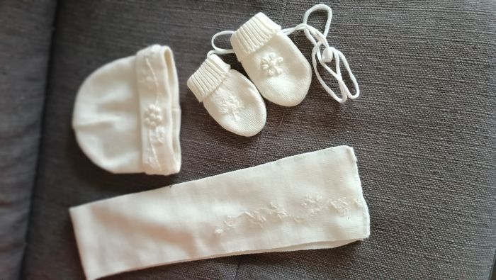 Ensemble bonnet, écharpe et moufle. Neuf sans étiquette. Crème. Écrit taille unique et le bonnet fait 15.5 cm de diamètre #bonnet_severinedubois40990