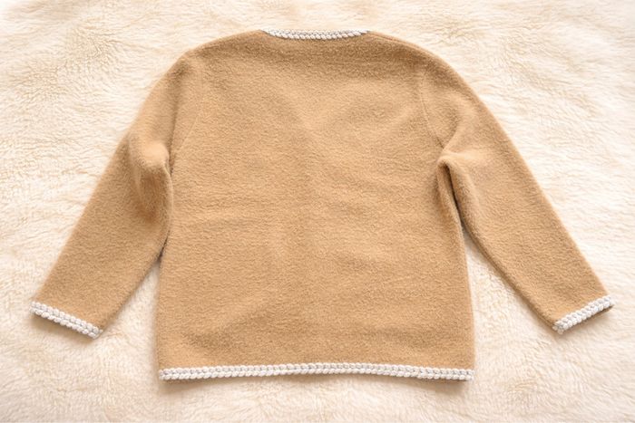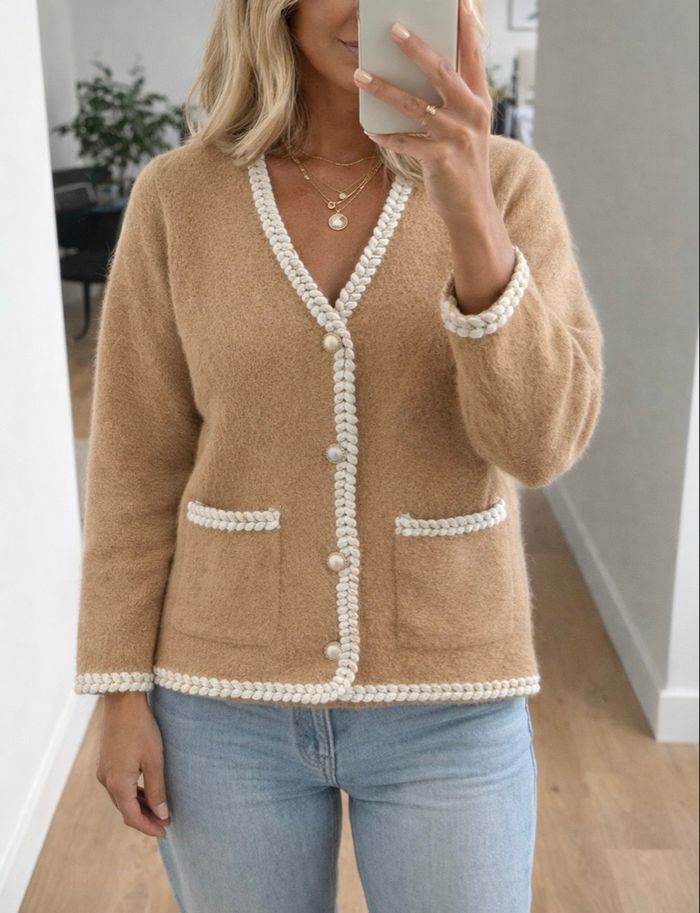 ✨ Je vends ce magnifique gilet cardigan de couleur camel, absolument parfait pour la mi-saison ou pour réchauffer une tenue. ✨ - Taille unique d’un 36 à un bon 42. - Liseré tressé blanc/dorée contrastant sur tout le col, les poches et les poignets. - Boutons de style "perles nacrées". - Col en V. - Aspect duveteux/tout doux. ✨ Dispo en couleur noir sur le dressing. ✨