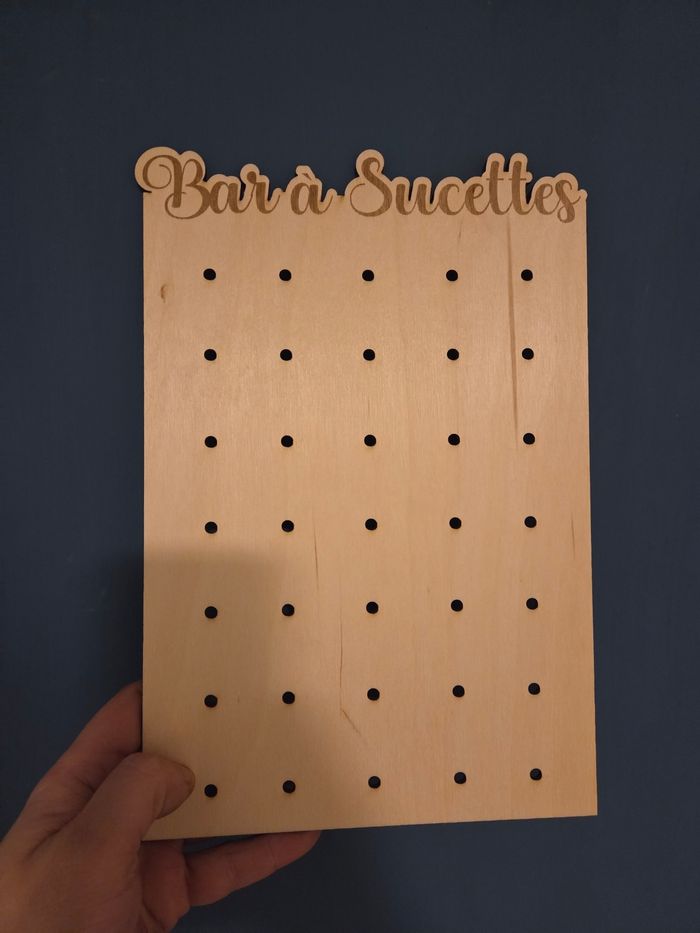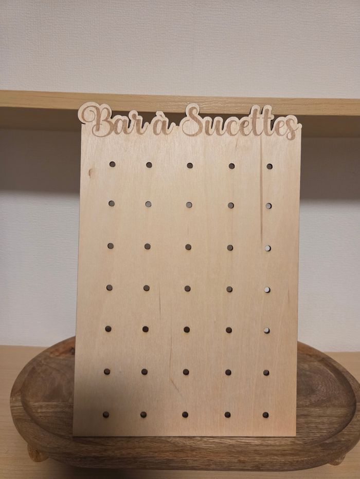 affiche en bois au format A4, conçue pour apporter une touche ludique et gourmande à votre **bar à sucettes** ! L’affiche peux contenir 35 sucettes🍭 Placée à l’entrée du bar à sucettes ou juste au-dessus de l’espace dédié, cette affiche devient une invitation gourmande qui attire petits et grands à profiter de ce moment sucré et festif ! Un détail amusant qui ajoute du charme et de la convivialité à votre événement. 🍭✨ Chevalet en suppléant pour 2e