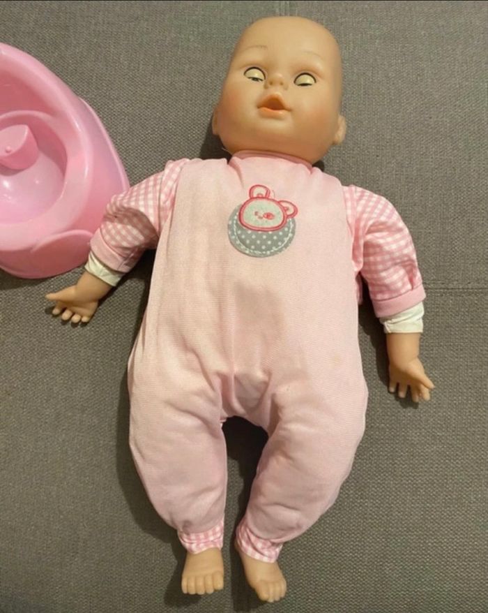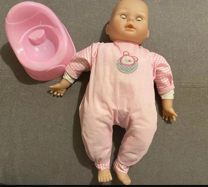 Bébé qui parle d’environ 45 cm avec un pot Le bonnet est accroché à la tenue Fonctionne très bien Tache sur le pyjama (voir photo) Vous achetez ce qui se trouve sur les photos