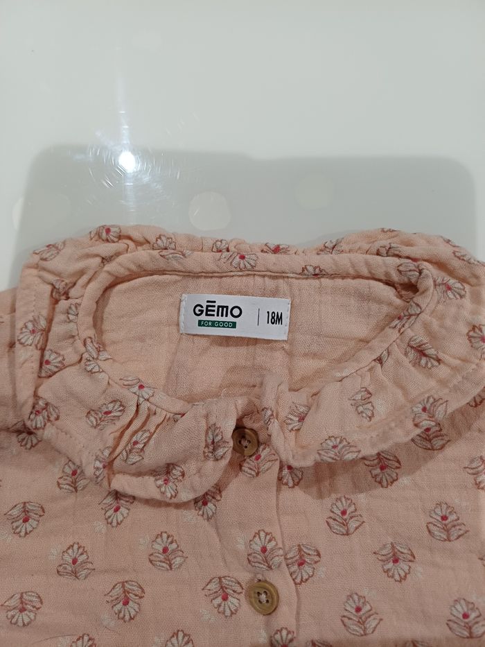 Très jolie chemise à manche longue en très bon état. La marque est GEMO et la taille 18 mois. S'attache avec 5 boutons voir la photo ci jointe.