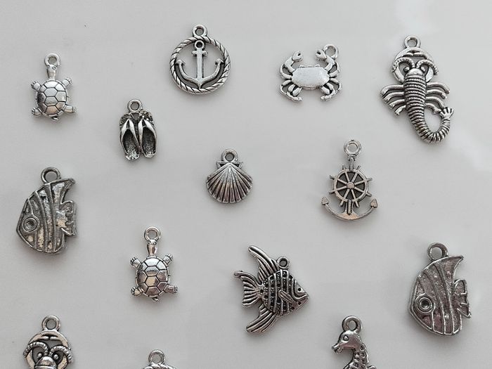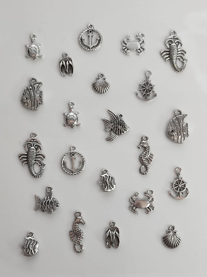 22 breloques charms argentées en métal thème mer poisson, ancre, crabe, hippocampe, coquillage, tong ...