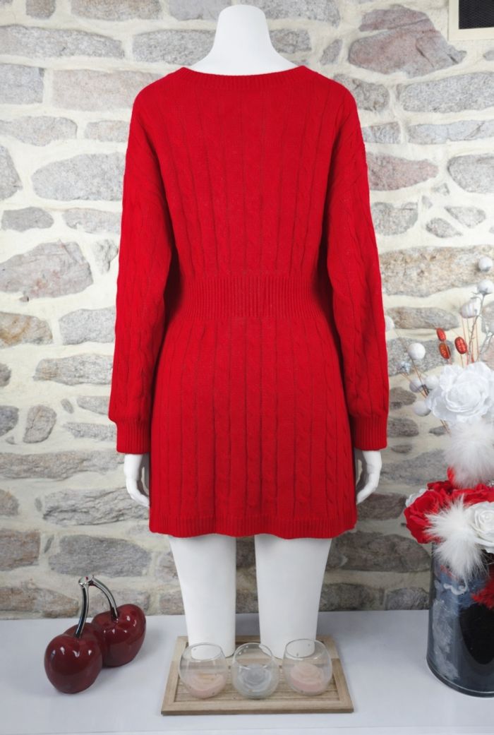 Robe pull en tricot maille torsadée rouge passion Femme taille 52 marque Boohoo ✴️ Col V ✴️ Manches longues ✴️ Maille torsadée ✴️ Couleur => Rouge passion ✴️ Composition => 100 % acrylique ✴️ Longueur => 96 centimètres ✴️ Mesure épaules à épaules => 64 centimètres ✴️ Tour de poitrine => 122 centimètres