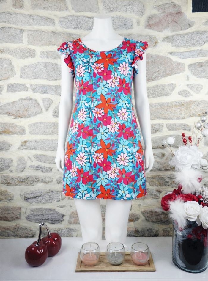 Robe éclosion tropicale turquoise et multicolore Femme taille 52 marque Missguided ✴️ Manches courtes volantées ✴️ Col rond ✴️ Coupe trapèze évasée ornée de motifs floraux stylisés de différentes tailles, dans une palette de couleurs joyeuses et estivales : turquoise, rose fuchsia, orange vif, blanc et marine ✴️ Composition => 95 % polyester 5 % elastanne ✴️ Longueur => 98,5 centimètres ✴️ Mesure épaules à épaules => 41 centimètres ✴️ Tour de poitrine => 135 centimètres