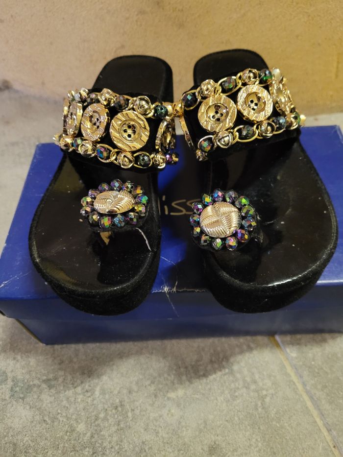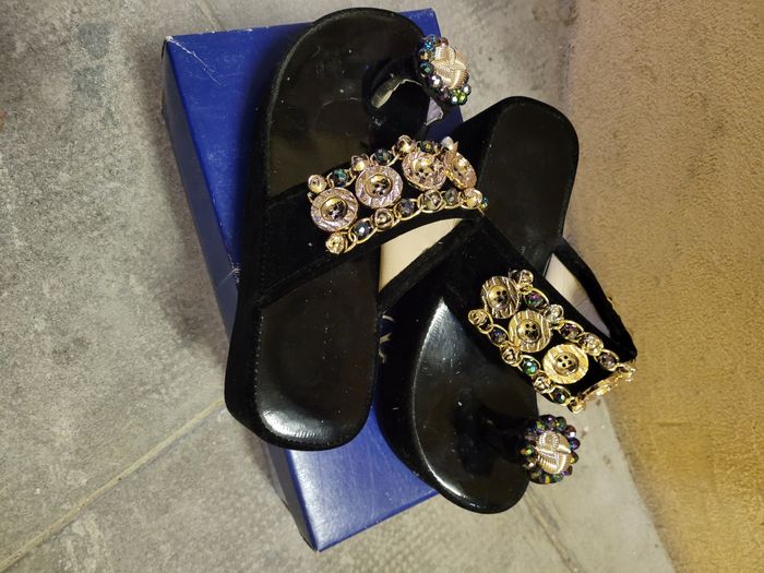 Sandales semi-compensées noires et décorations de bijoux/breloques.Bague à l'orteil style "tongs" pointure 36. Très bon état, peu portées car trop grandes pour moi. Pas de marque.