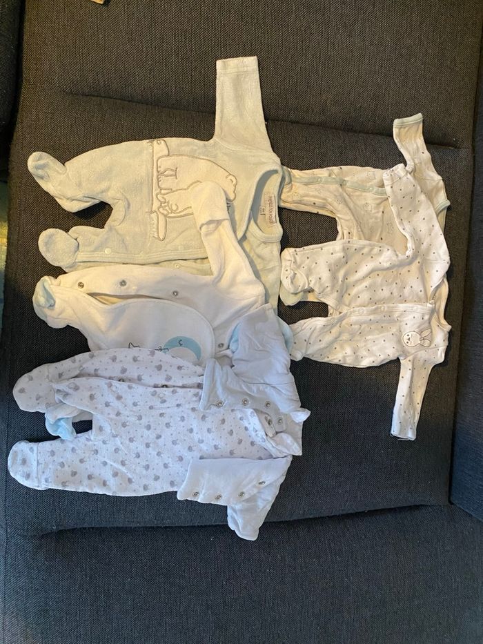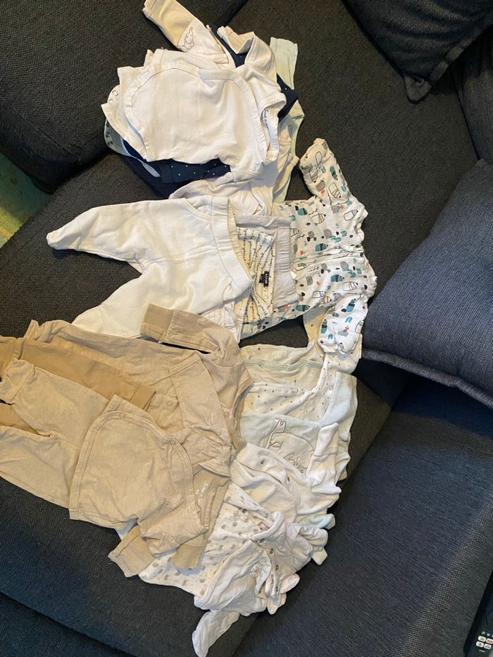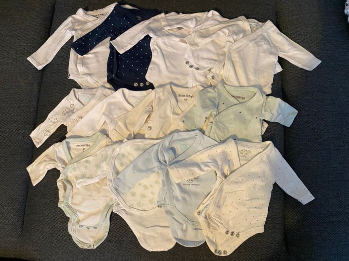 Lot vêtements prématurés : - 14 bodys - 2 turbulettes (1 avec manche - 1 adapté au siège auto) - 1 combi chaude - 1 combi fine marron - 1 ensemble fin (2 pantalons - t-shirt manche longue) - 4 pantalons - 3 pyjamas - 2 pyjamas fin Différents marques (Orchestra, Kiabi, Tex, Zeeman..) en très bon état