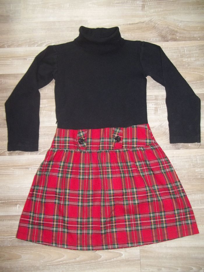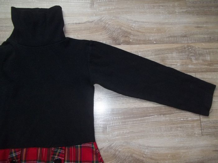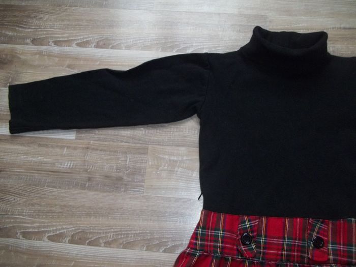 Robe bi-matière à manches longues en jersey côtelé noir sur le haut et tissé écossais rouge sur le bas. "Pull" extensible à col roulé (11 cm double épaisseur à replier) (97 % coton 3 % élasthanne). "Jupette" évasée en simple épaisseur 100 % coton. à carreaux jaune/vert/bleu sur fond rouge, 2 boutons juste décoratifs à la taille, petite ouverture zippée sur côté taille pour enfilage. Longueur totale env 71 cm (haut 32 cm, bas 49 cm), manches 42 cm, largeur taille 32 cm, poignets 10 cm.