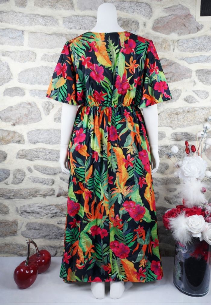 Robe longue jungle envoûtante du soir Femme Taille 54 marque Boohoo ✴️ Décolleté en V ✴️ Manches courtes évasées ✴️ Taille élastiquée ✴️ Coupe légère et fluide arborant un imprimé tropical audacieux et coloré, avec feuilles de palmiers et des fleurs d'hibiscus dans des tons vifs de rouge, orange, rose et vert sur un fond noir ✴️ Composition => 100 % polyester ✴️ Longueur => 133 centimètres ✴️ Mesure épaules à épaules => 43 centimètres ✴️ Tour de poitrine => 138 centimètres