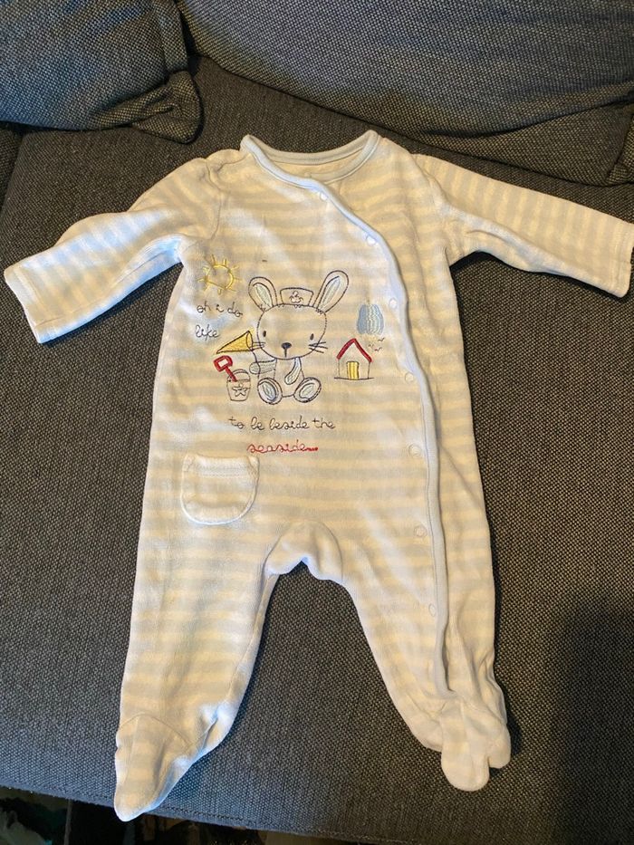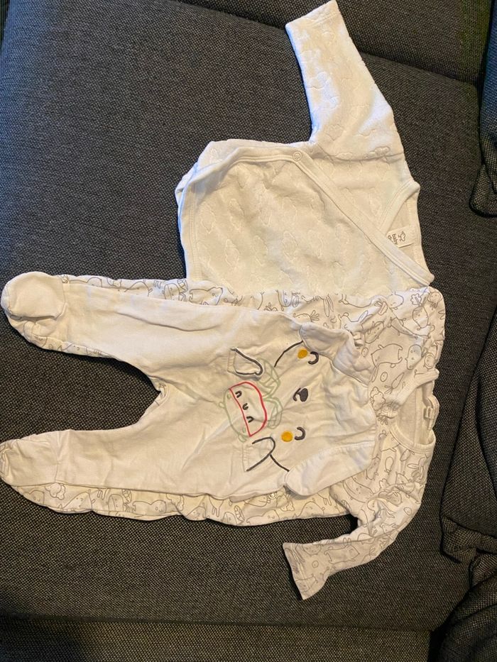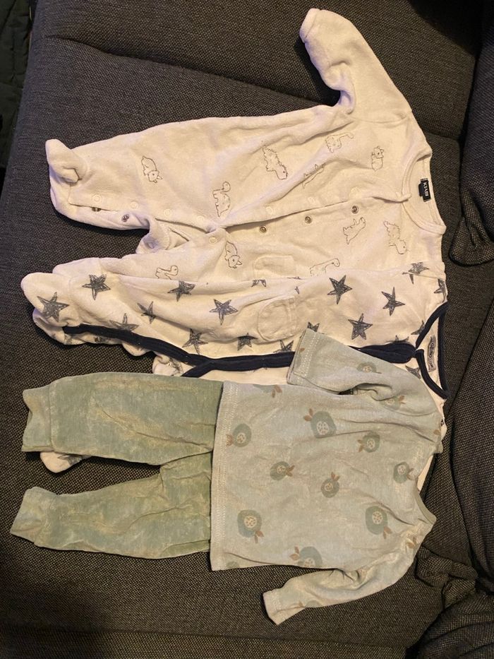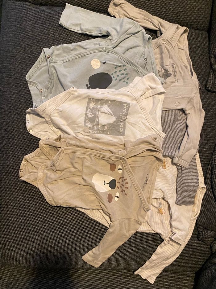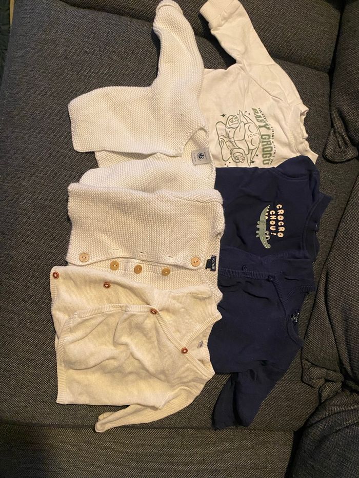 Lot vêtements garçons : - 6 t-shirt dont 1 manche courte - 7 pantalons - 2 salopettes - 7 bodys - 7 pulls/gilets - 1 veste chaude - 8 pyjamas dont 1 fin Différentes marques (Petit bateau, Kiabi…)