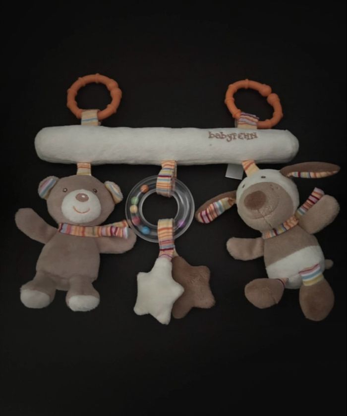 Je vend ce tapis d'éveil ourson + un jeux qui s'accroche sur le cosy de la marque Babyfehn Le nid avec 5 jouets amovibles consiste en des matériaux particulièrement doux et garantit aux bébés un confort optimal grâce au bord rembourré Le canard avec pouêt-pouêt, le nounours avec hochet à balle et le chien avec cri d'animal procuren une stimulation auditive ainsi qu'une première interaction avec l'environnement dans les différentes phases de croissance du bébé Le papier froufrou dissimulé entretient le plaisir de jeu et améliore l'attention du bébé - Avec le miroir en forme de fleur, le bébé apprend à se découvrir lui-même de façon ludique Stimulation du sens du toucher et de la préhension : Les jouets suspendus à l'arceau sont facile à saisir par les petites mains de bébé et développent par le jeu la motricité du bébé dès la naissance