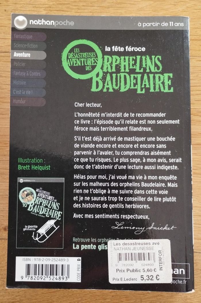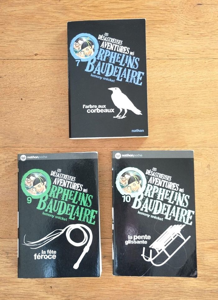 lot de 3 livres Les désastreuses aventures des orphelins Baudelaire de Lemony Snicket - tome 7 : l'arbre aux corbeaux - tome 9 : la fête féroce - tome 10 : la pente glissante Editions Nathan pour enfant dès 11 ans Quelques traces d'utilisation