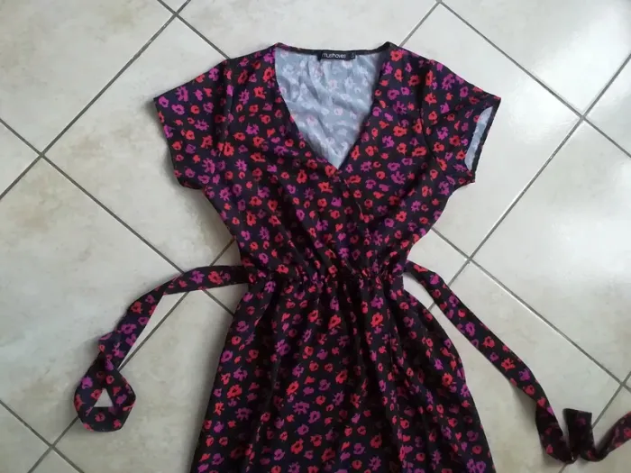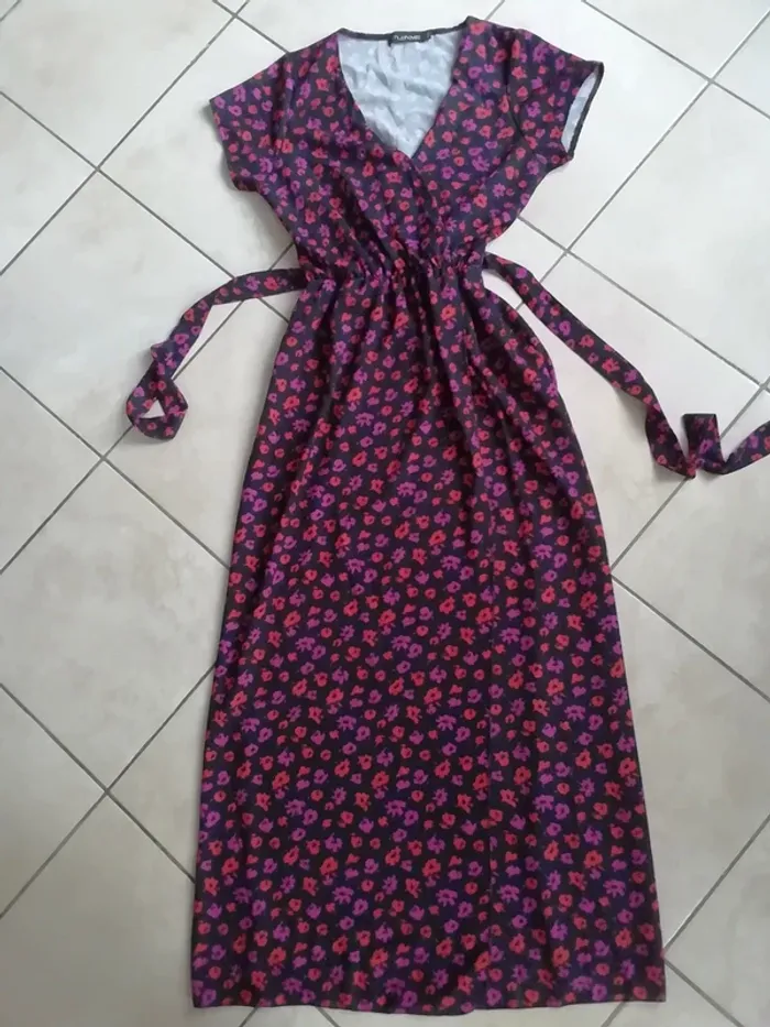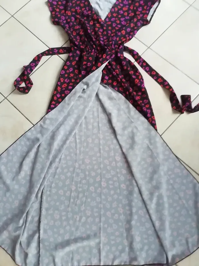 DE COULEUR DE FOND NOIR A MOTIFS FLEURIS TON ROSE/ROUGE. BAS COUPE PORTEFEUILLE. CEINTURE SOUS PASSANTS. TAILLE S/M. ÉTAT NEUVE !! LONGUEUR TOTALE (voir dernière photo) : env 137cm.