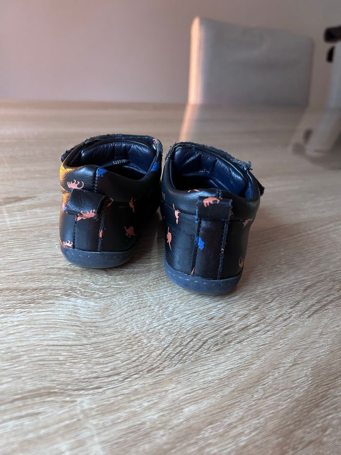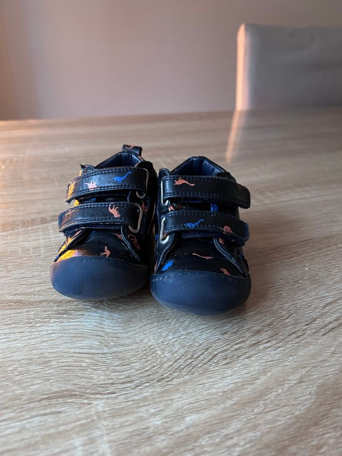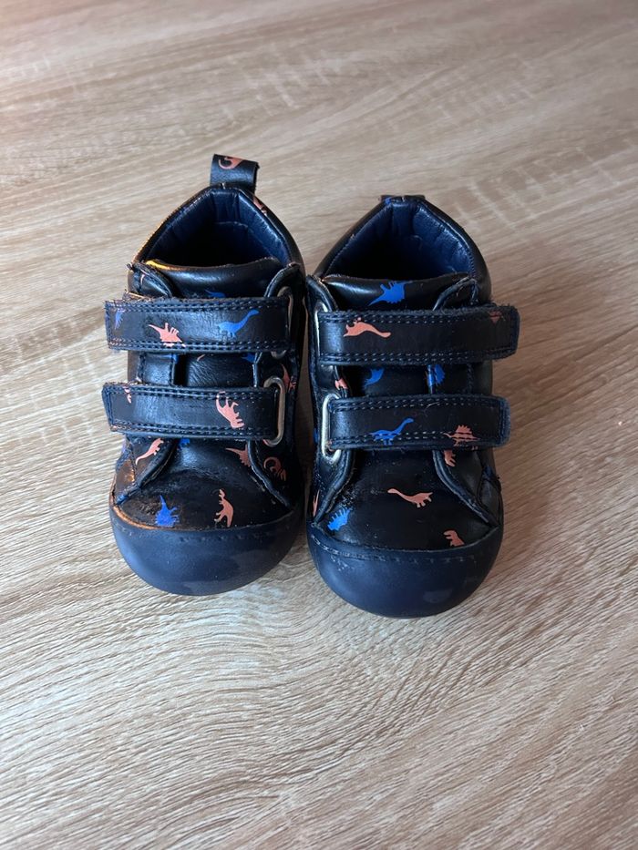 Petites chaussures bleu marine avec dessins de dinosaures. En très bon état, pointure 21