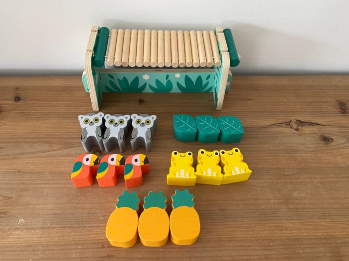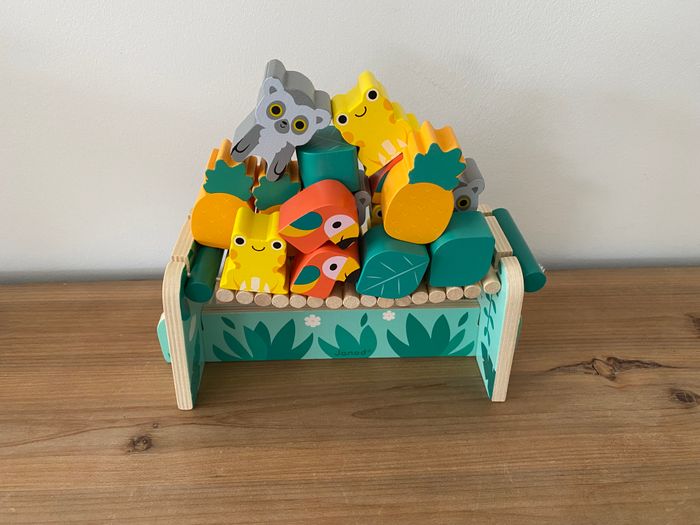 Y aura t il de la place pour tout le monde sur le pont suspendu ? Au cœur de la forêt tropicale, ce joli pont de singe en bois attend une joyeuse bande d’animaux prêts à le traverser. Grenouilles, lémuriens, perroquets, feuilles et ananas devront trouver leur équilibre dans ce jeu d’adresse coloré et amusant. On commence par assembler le pont en trois parties, puis l’enfant s’amuse seul ou à plusieurs à empiler les différentes pièces sans tout faire tomber. Patience et minutie seront nécessaires pour réussir à faire tenir tous ces animaux rigolos. Ce jeu d’équilibre comprend 15 pièces à empiler. Il aide à développer la dextérité, la coordination et la concentration dès le plus jeune âge. Adapté aux enfants à partir de 2 ans. Fabriqué en bois issu de forêts gérées durablement certifiées FSC. Peinture à l’eau. État Jeu d’occasion en très bon état général. Points forts Jeu en bois solide et durable Favorise la motricité fine et la concentration Peut se jouer seul ou à plusieurs Univers tropical coloré et attractif janod25