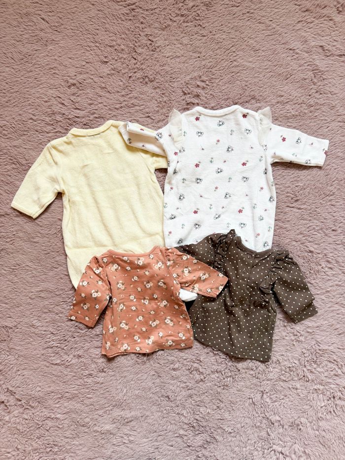 Lot de 2 pyjamas bébé et 2 t-shirts, taille 1 mois. En bon état général. Marques: Kiabi, C&A, Disney.