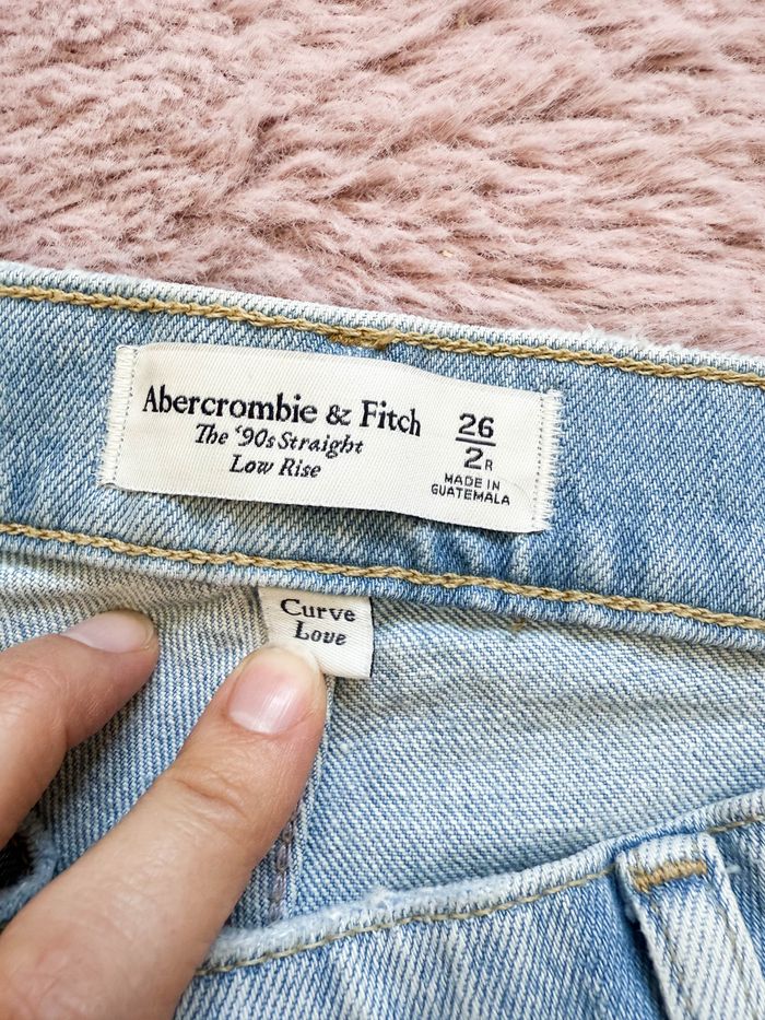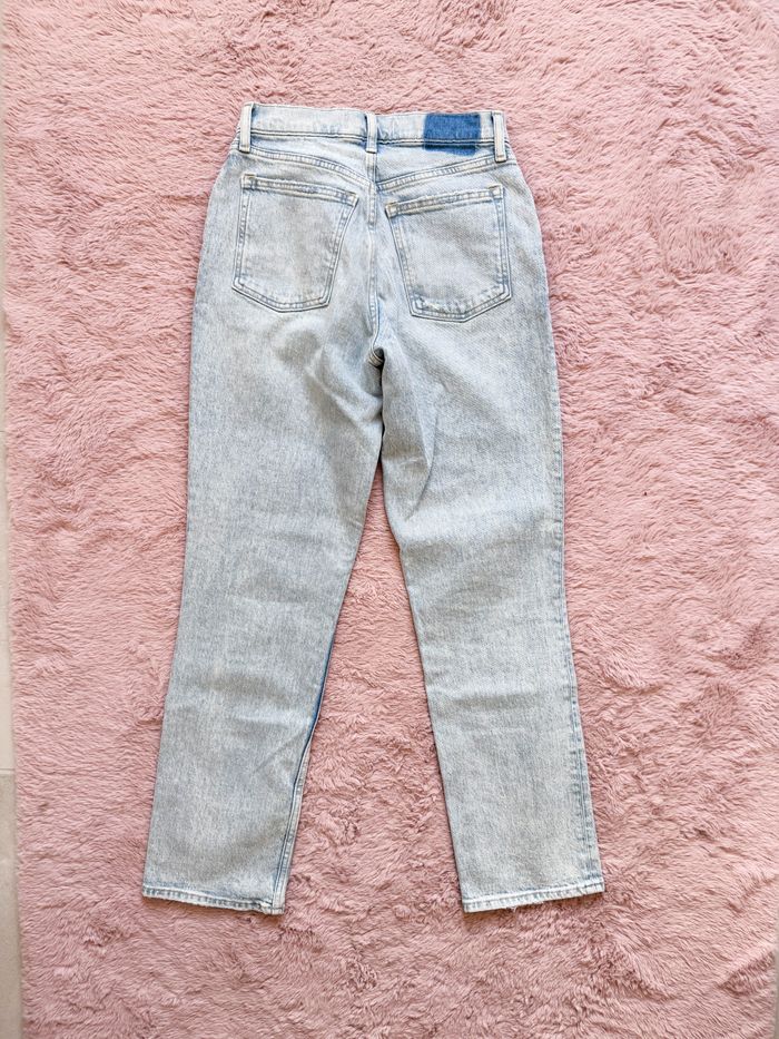 Jean bleu clair, coupe droite taille basse typique des années 90.