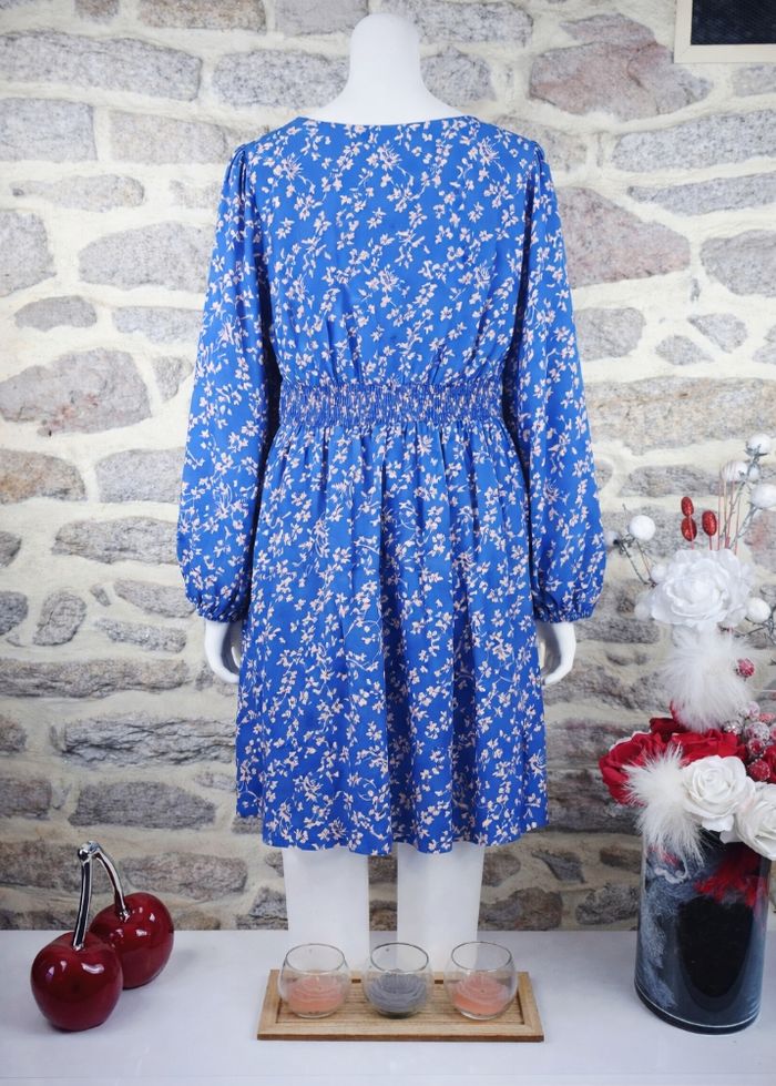 Robe manches longues bleue et blanche Femme taille 54 marque Boohoo ✴️ Manches longues bouffantes ✴️ Taille smockée froncée élastique ✴️ Décolleté en V ✴️ Coupe fluide arborant un motif délicat de petites fleurs/brindilles écrus crème, beige clair blanc sur un fond bleu ✴️ Composition => 100 % polyester ✴️ Longueur => 107 centimètres ✴️ Mesure épaules à épaules => 42 centimètres ✴️ Tour de poitrine => 142 centimètres ✴️ Tour de taille => 110 à 140 centimètres