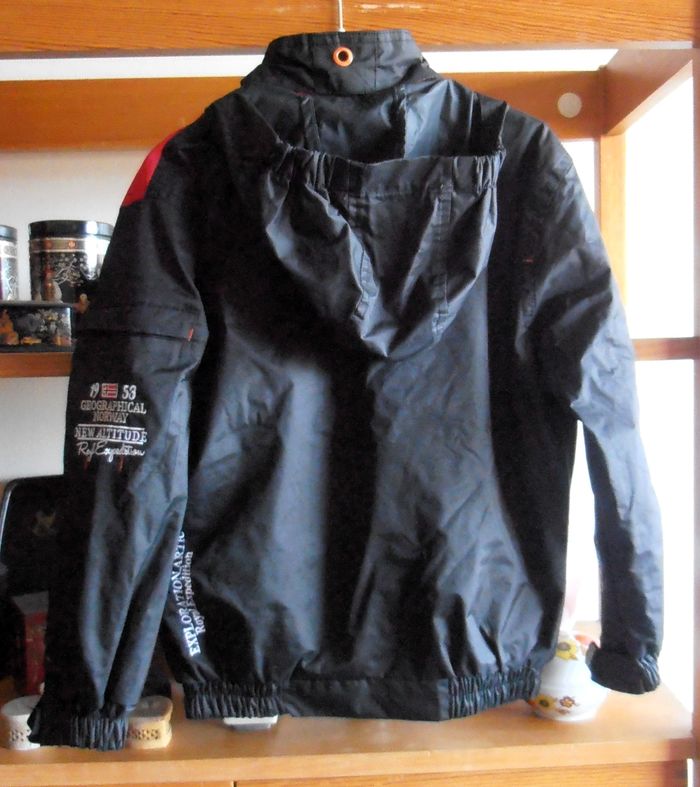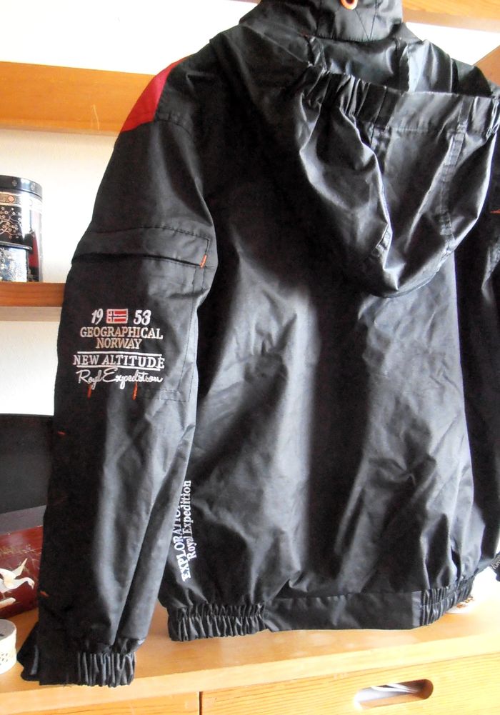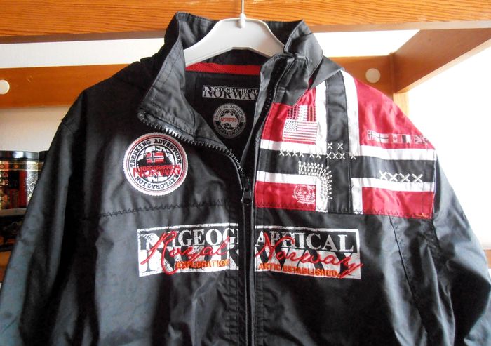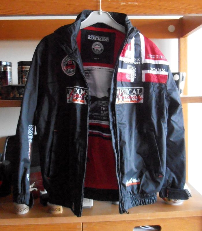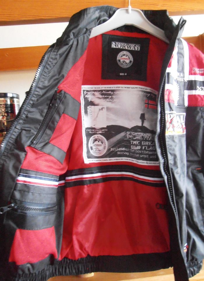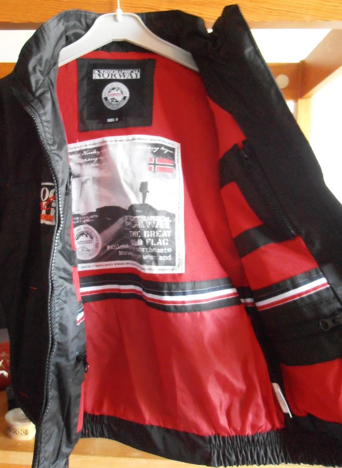 Manteau à capuche, parka enfant, Geographical Norway, taille : 8 ans, couleur noir, rouge et blanc avec motifs de logos, drapeaux etc... Capuche, manches longues, fermeture éclair, deux poches avant et quatre à l'intérieur, imperméable. Très bon état. Parfait pour protéger du froid et de la pluie !