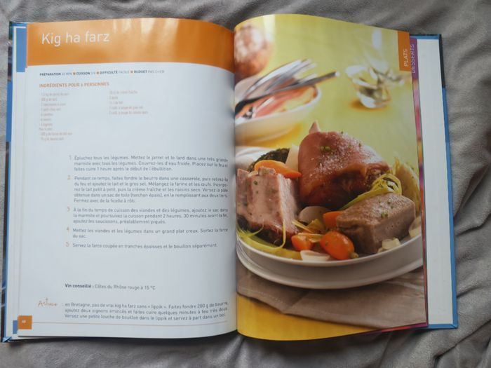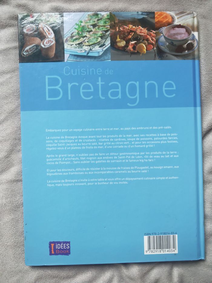 Livre de cuisine « Cuisine de Bretagne » (édition Idées Book). Recettes bretonnes traditionnelles : entrées, plats, desserts (kig ha farz, poissons, fruits de mer, galettes, kouign-amann, etc.). Beau livre illustré avec photos. État : très bon état. 📌 Livre utilisé mais propre 📌 Pages propres, non déchirées 📌 Couverture en bon état 📌 Coins légèrement usés, rien de dramatique (voir photos) 📌 Pas d’autres défauts notables ISBN visible sur la dernière photo. Envoi soigné.