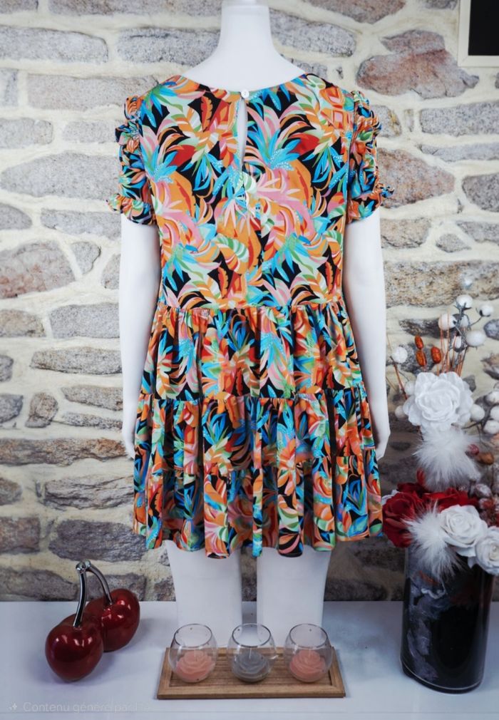 Robe cocktail tropical noire et multicolore Femme taille 54 marque Boohoo ✴️ Col rond ✴️ Manches courtes volantées ✴️ Coupe ample légère et fluide arborant un motif tropical audacieux et joyeux, composé de arges feuilles et de formes végétales dans des tons vifs d'orange, de bleu turquoise, de vert clair, de rose et de touches de noir pour le contraste ✴️ Composition => 100 % polyester ✴️ Longueur => 99,5 centimètres ✴️ Mesure épaules à épaules => 43 centimètres ✴️ Tour de poitrine => 139 centimètres