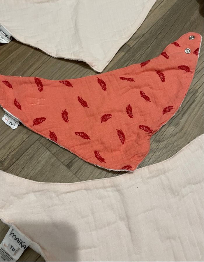 Lot de 3 bavoirs bandana à pression Jamais utilisé, avec étiquette 2 bavoirs en tissu rose pâle et 1 corail avec plume