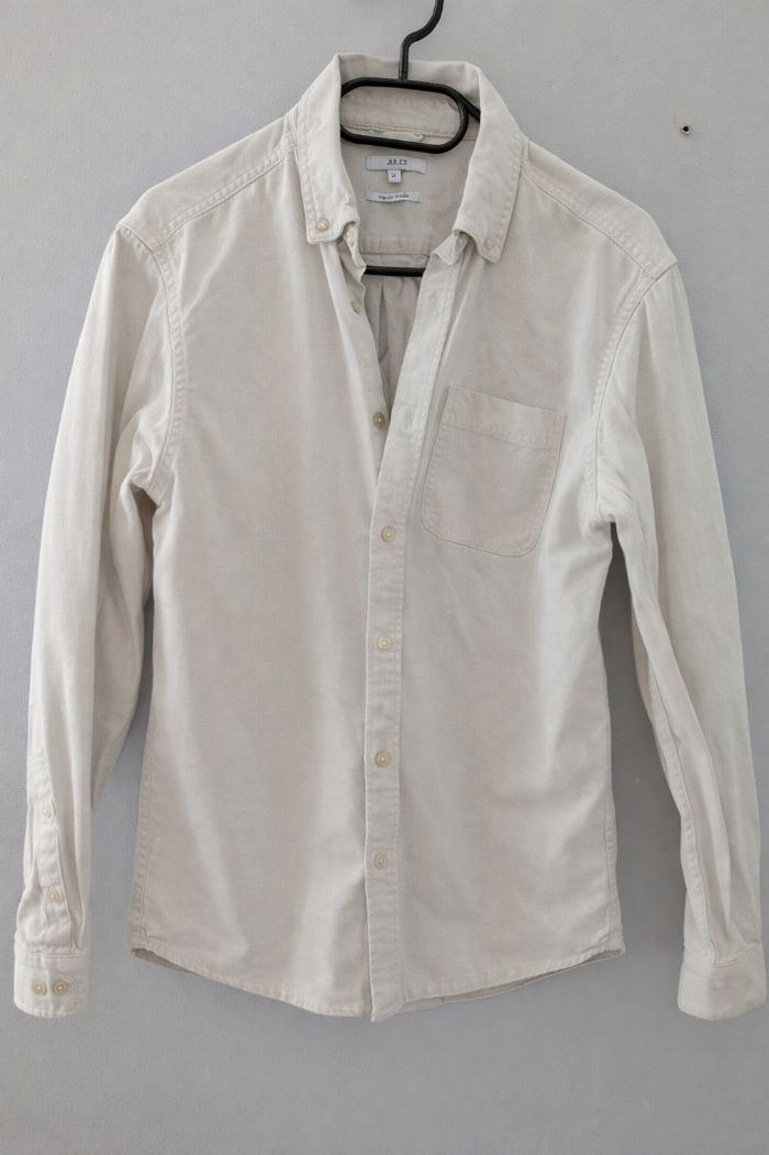 Marque : Jules Modèle : Théo Coupe : Regular (droite) Taille : M Couleur : Beige / Sable Matière : Coton épais type sergé (twill), très résistant et de bonne tenue. État : Très bon état général. La chemise est solide, sans taches ni trous. Note : Elle est froissée sur les photos car elle sort du stockage, mais elle sera lavée et pourra être repassée avant l'envoi pour un aspect impeccable. Détails : Col boutonné (button-down) pour une meilleure tenue. Une poche poitrine. Matière idéale pour toutes les saisons (assez épaisse pour être portée seule ou sur un t-shirt). Style polyvalent : parfait pour un look casual, workwear ou plus habillé avec un chino.
