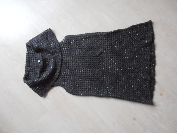 Pull en mailles femme, marque Mim, couleur gris foncé (anthracite) avec des fils argentés. Col roulé, sans manches (à porter avec un T-shirt manches longues dessous par exemple), coupe droite longue. Taille M-38. Pull chaud et confortable !